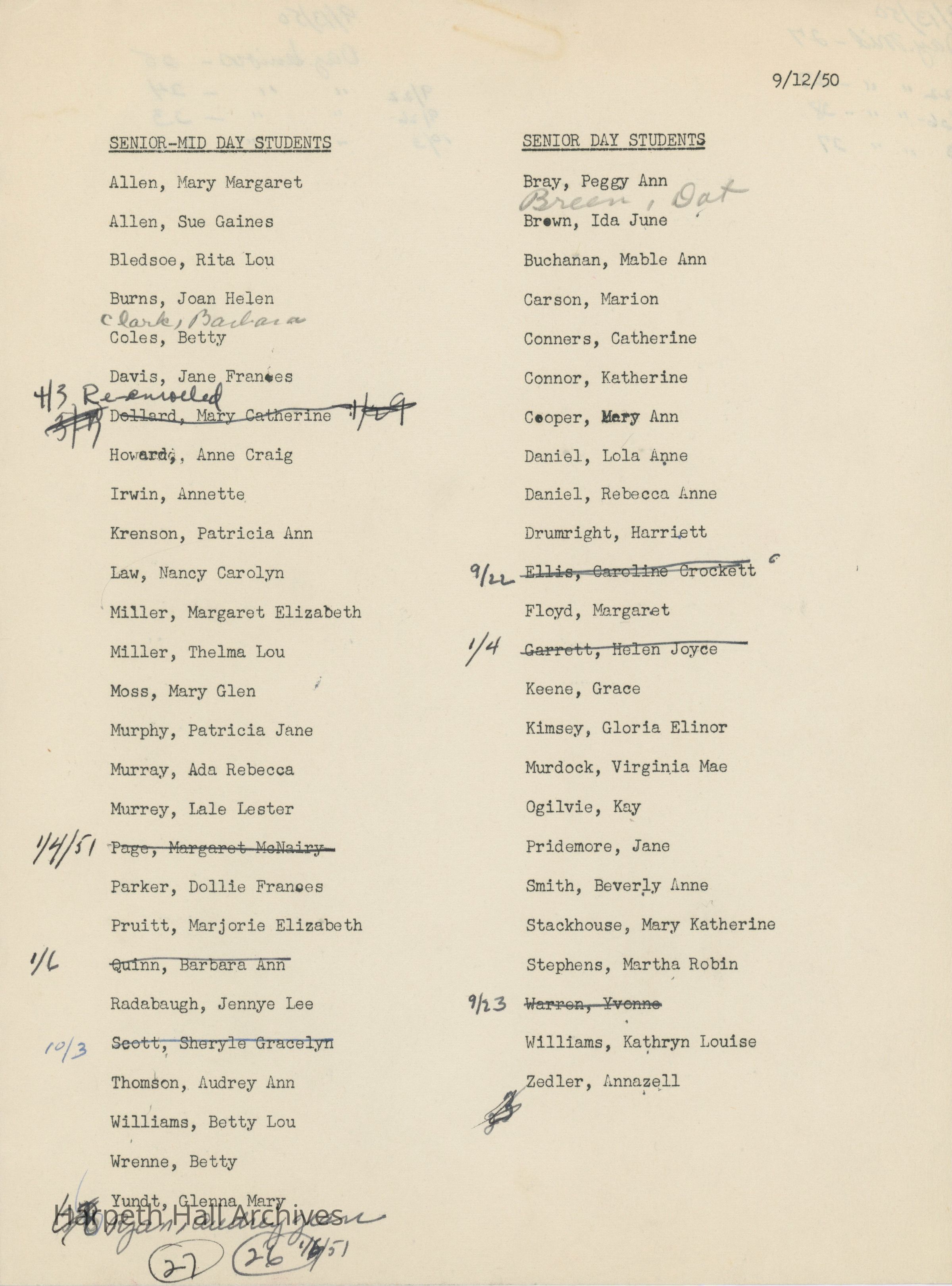 List of Senior-Mid Day Students and Senior Day Students, 1950-51Entry/Object ID