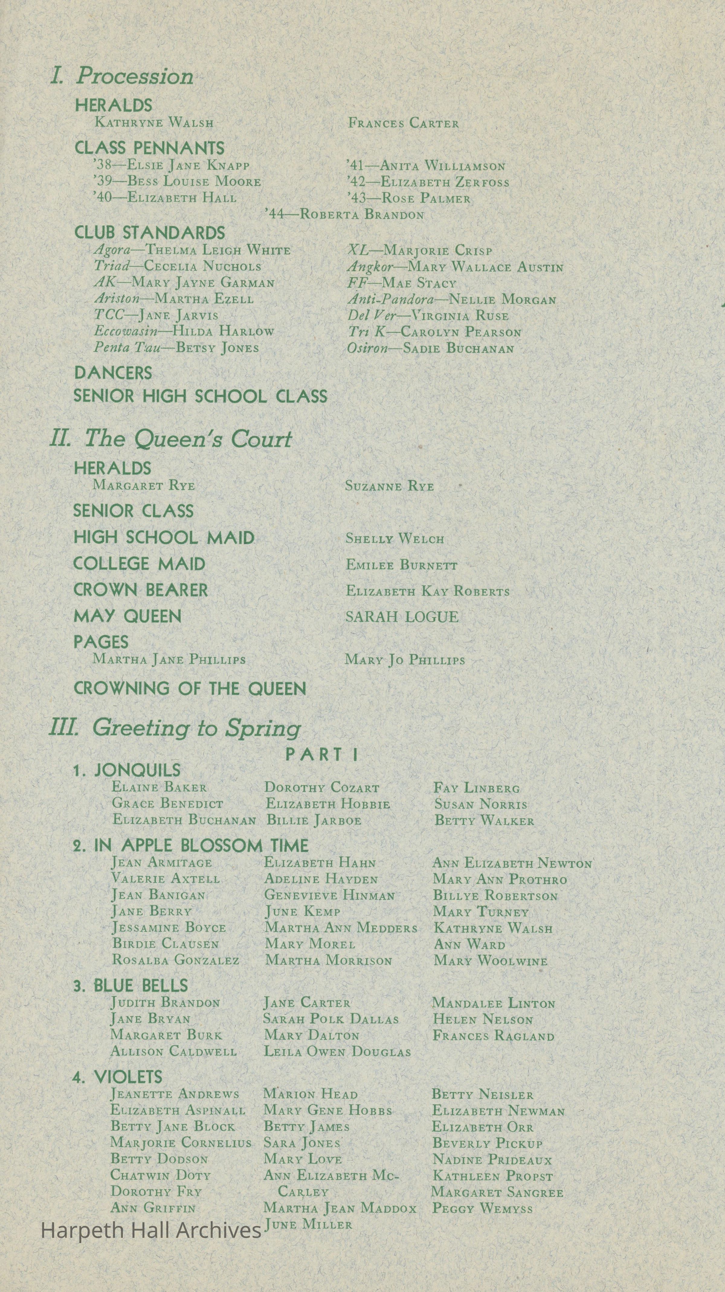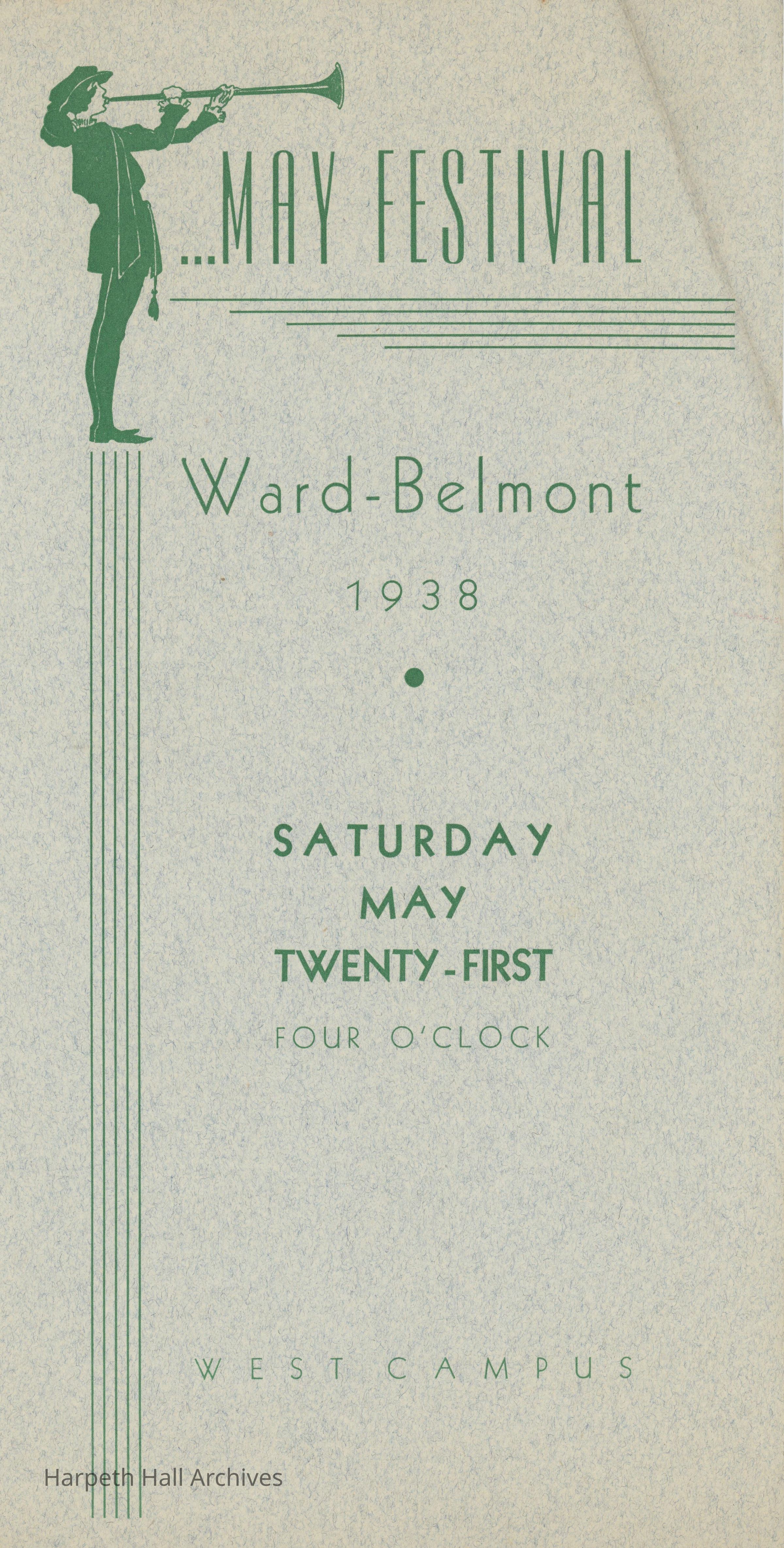 A program for the 1938 Ward-Belmont May Festival, presented by the Department of Physical Education. Held on the West Campus on Saturday, May 21, 1938, at 4:00 P.M. The program consisted of three parts: a procession, the presentation of the May Queen and her court, and the festival entertainment and dancing, separated into two acts (titled Greeting to Spring). The 1938 May Queen was Sarah Logue.Context