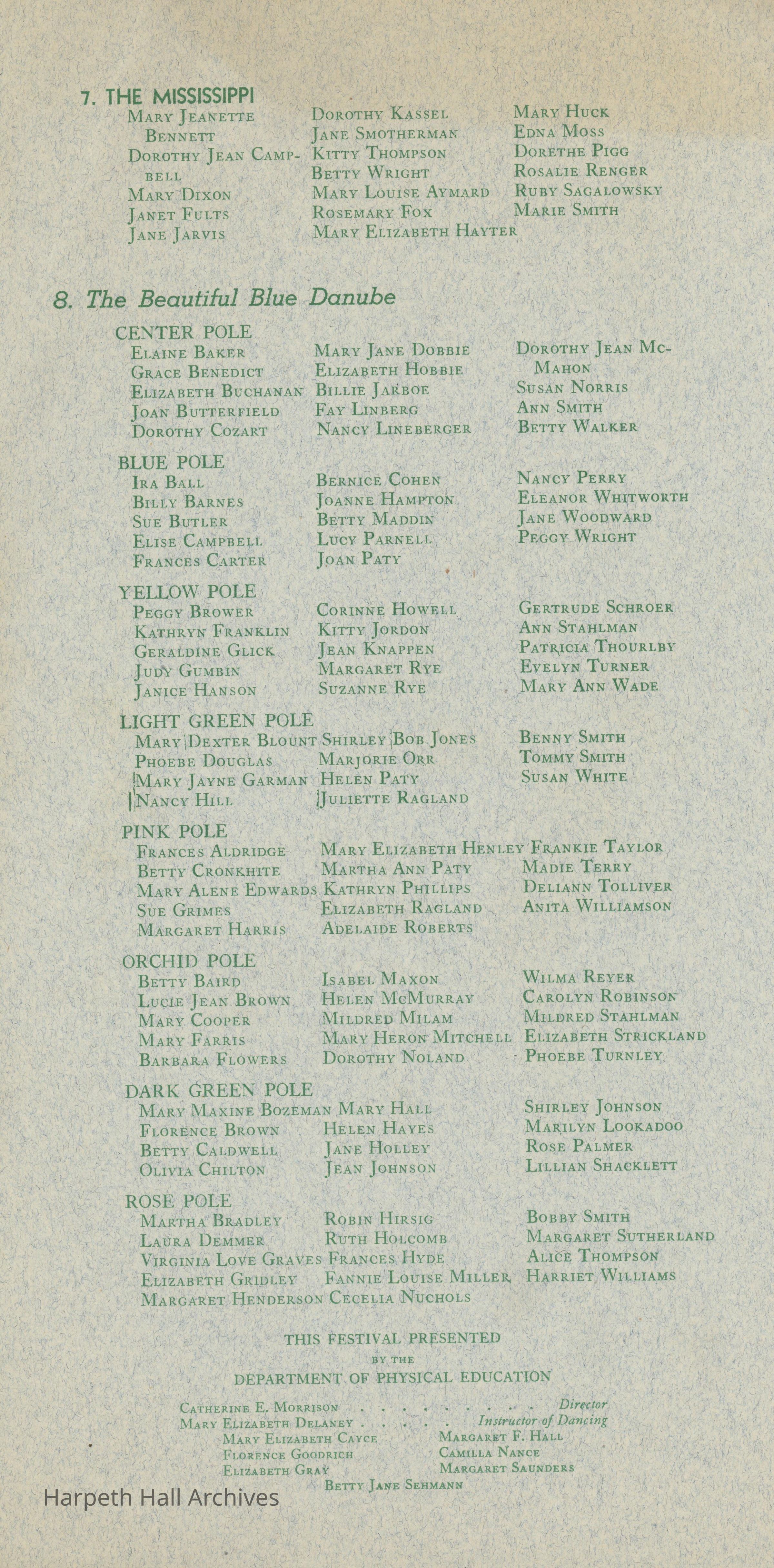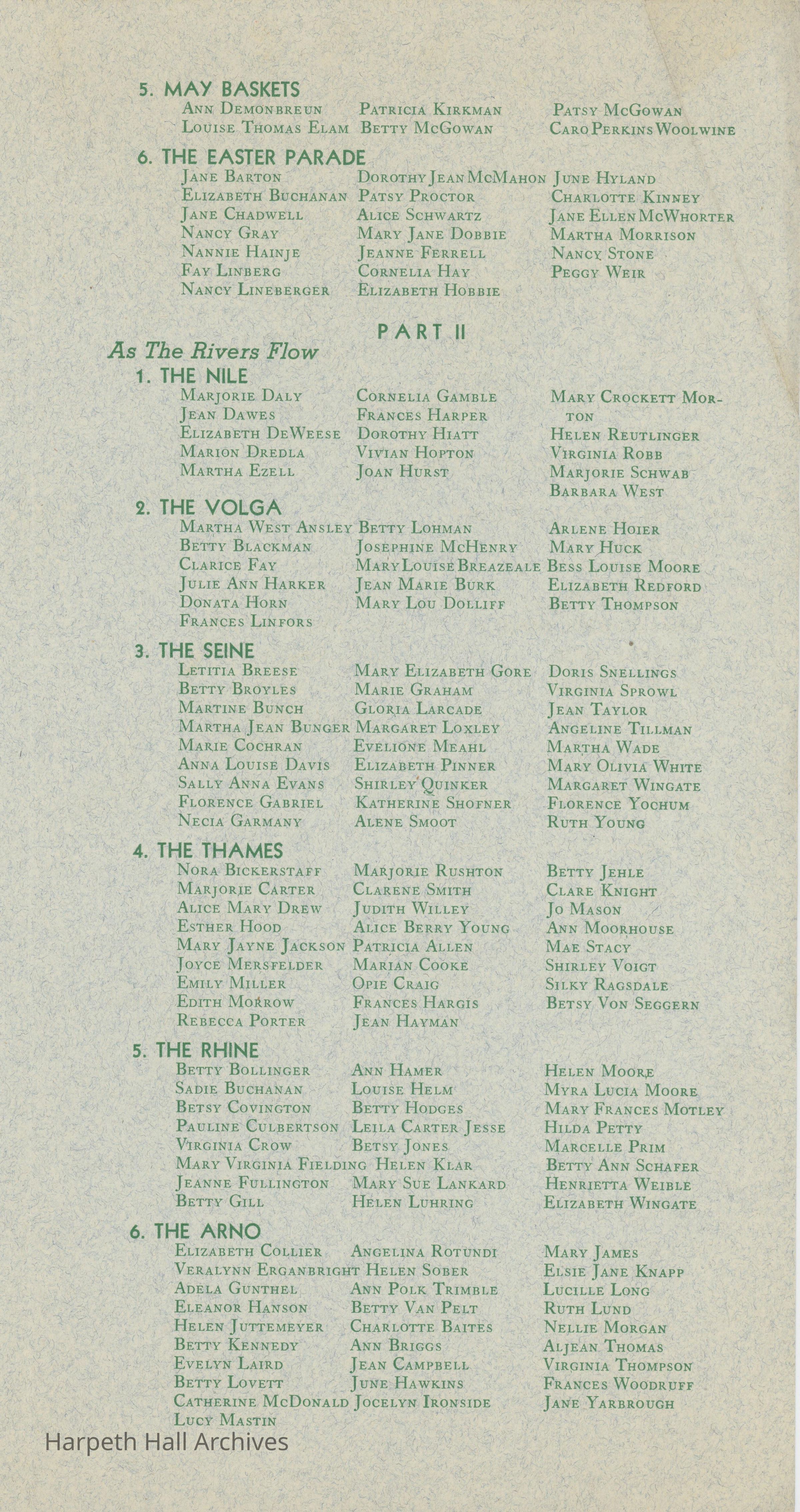 The annual May Day Festival was described as "the highlight of the social year at Ward-Belmont" (Milestones, 1945). The festivities involved dancing, processions, the crowning of the May Queen and her court, and the traditional May Pole Dance. The Lady of the Hall, Harpeth Hall's highest honor, evolved from the May Queen ceremony.Collection