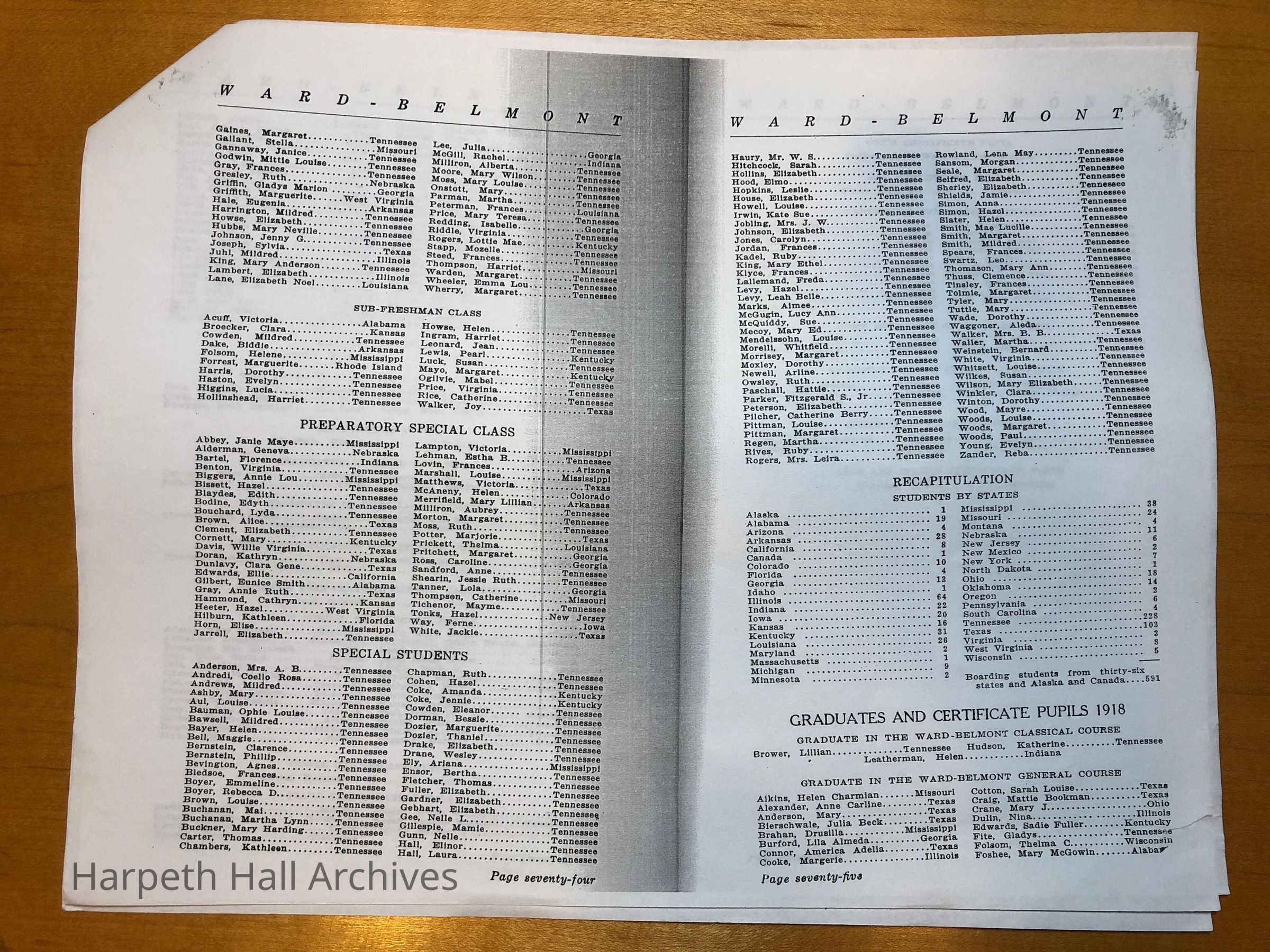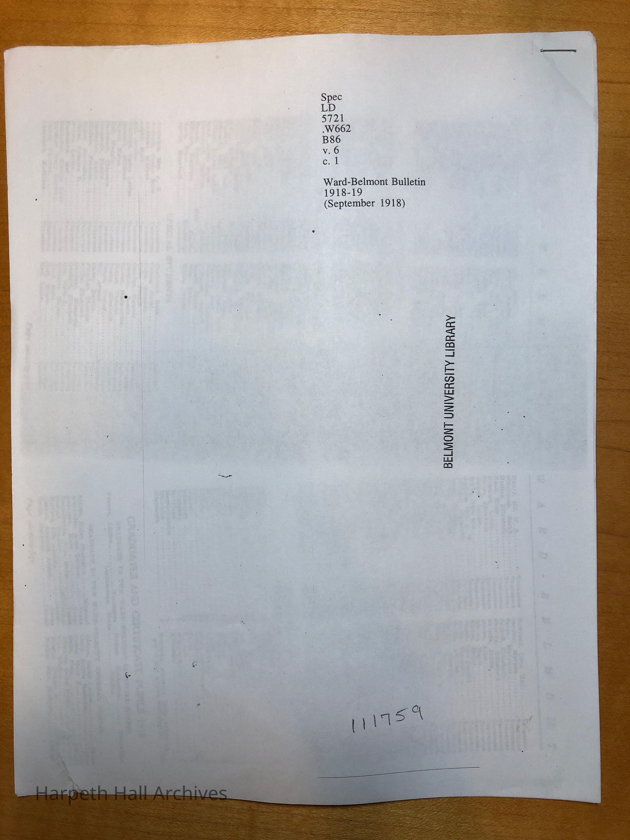Ward-Belmont Bulletin for 1918-1919 published in September of 1918. Details student info.