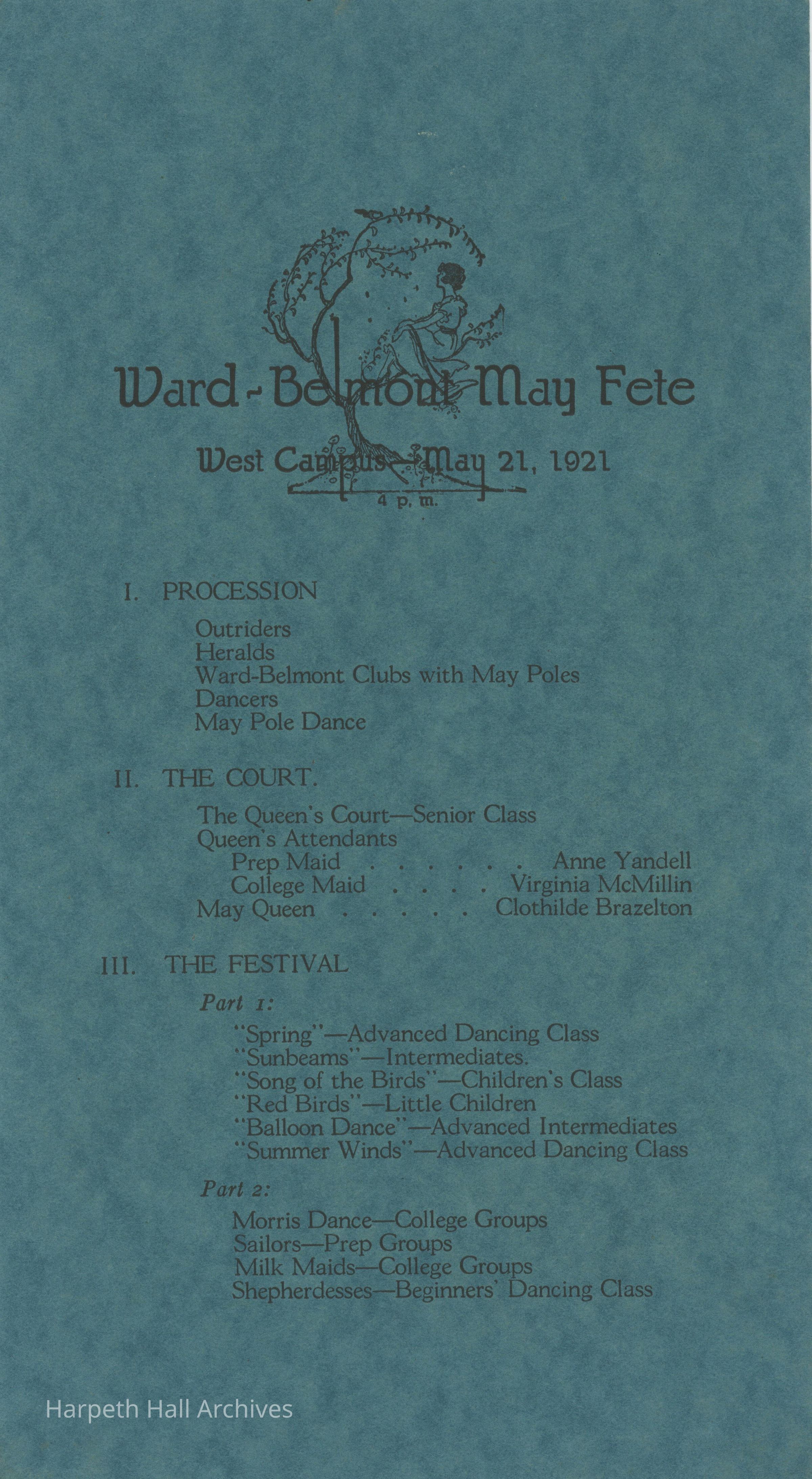 A program for the 1921 Ward-Belmont May Fete. Held on the West Campus on May 21, 1921, at 4:00 P.M. The program consisted of three parts: a procession, the presentation of the May Queen and her court, and the festival entertainment and dancing. The 1921 May Queen was Clothilde Brazelton.Context