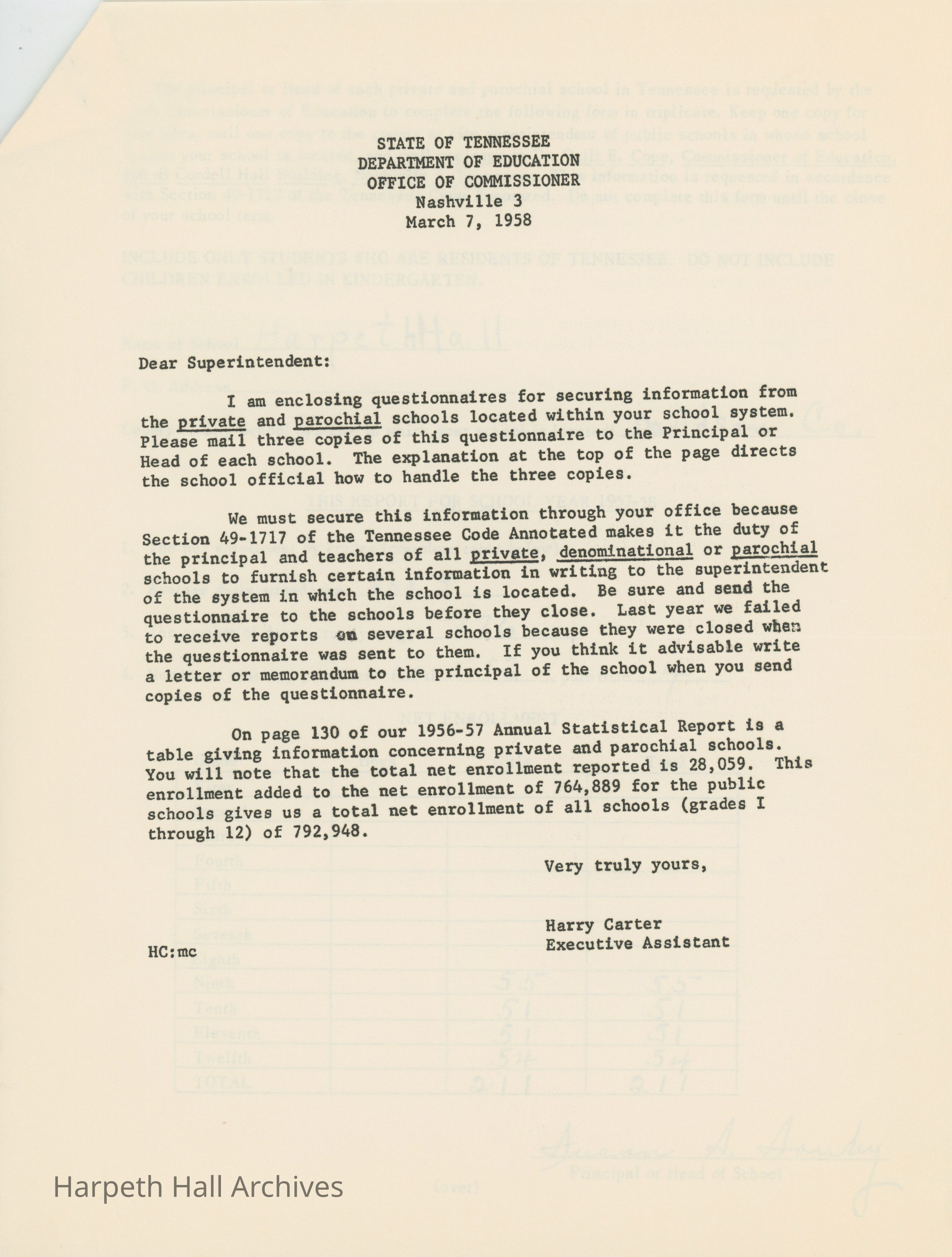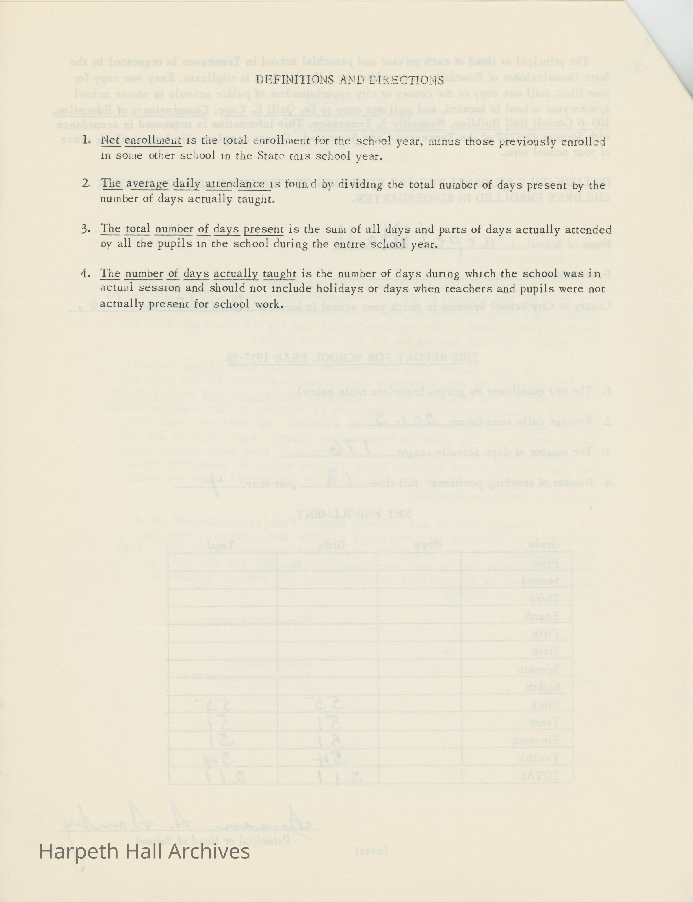 Report for TN Department of Education on Harpeth Hall's attendance, instructional days, and teaching positions.Collection