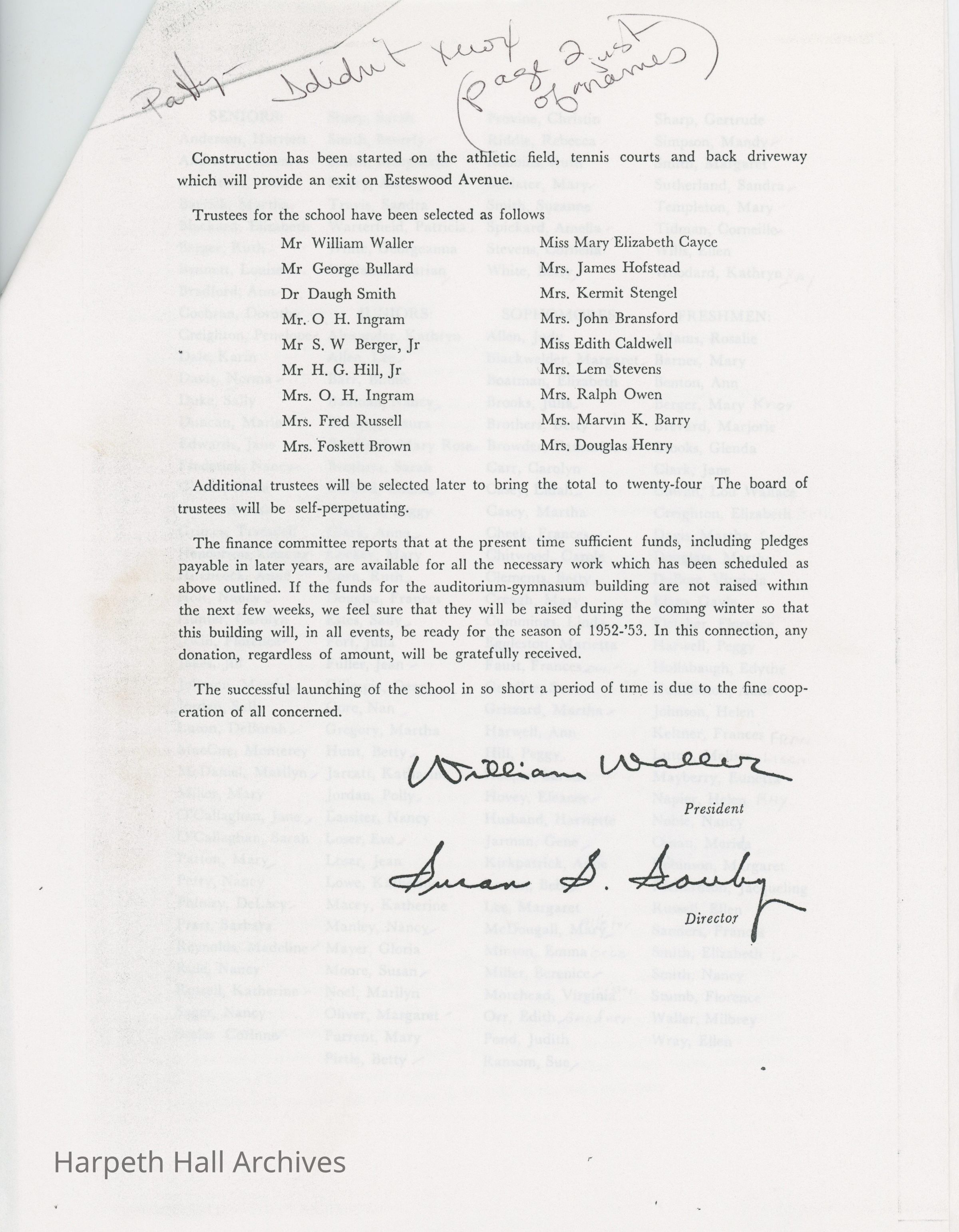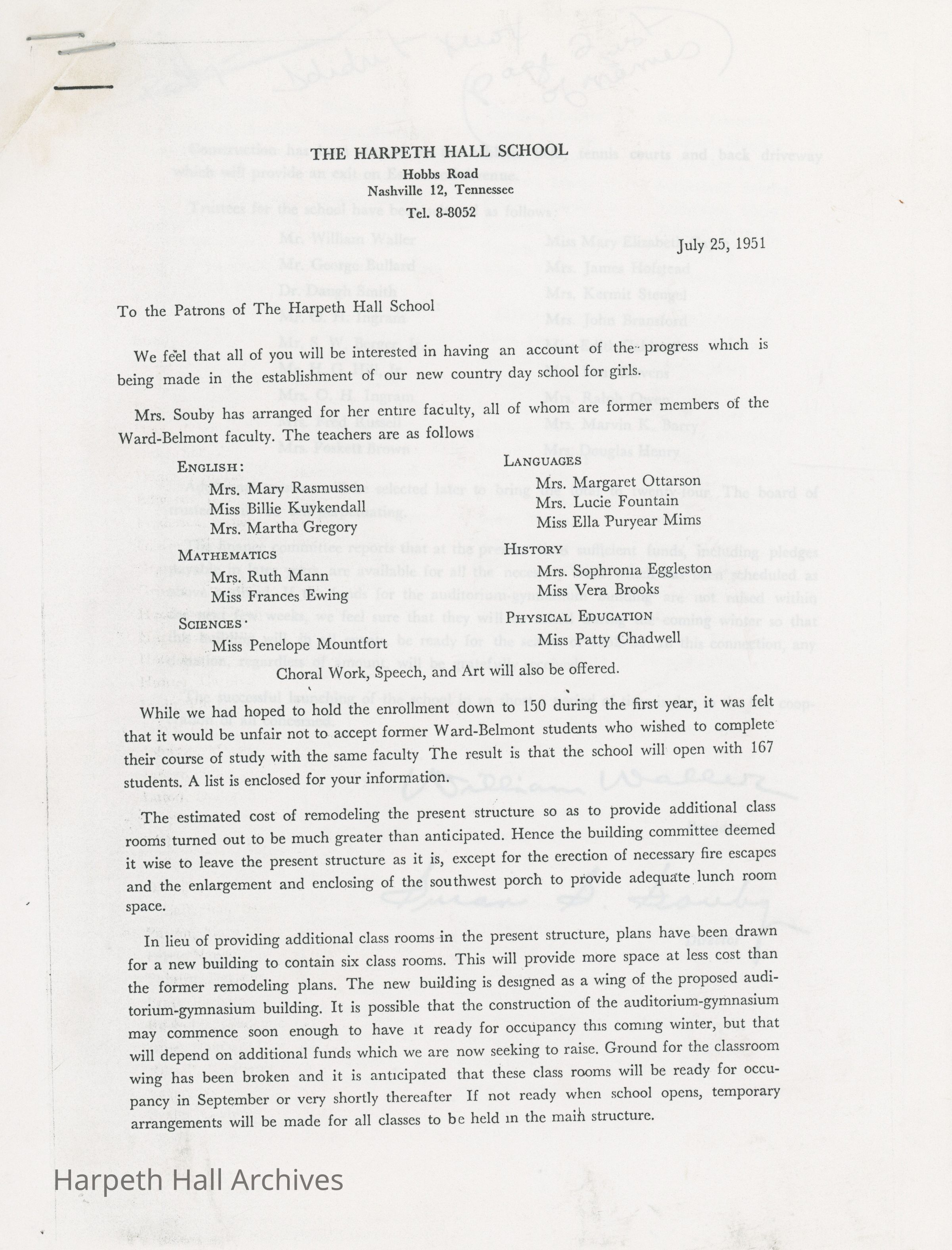 A photocopy of a letter from Mr. William Waller and Mrs. Susan S. Souby to the patrons of the Harpeth Hall School, dated July 25, 1951. The letter served to provide an account of the progress being made in the establishment of the new school. Names of the faculty (all of whom were former members of the Ward-Belmont faculty), first board of trustees, and the 167 students comprising the first Harpeth Hall senior, junior, sophomore, and freshman classes are listed. Courses were taught in English, mathematics, the sciences, languages, history, physical education, choral work, speech, and art. Construction of fire escapes, lunch room space, the athletic field, tennis courts, back driveway, and a new building containing six classrooms alongside the auditorium-gymnasium building was discussed. It was noted that donations towards the construction, regardless of amount, would be "gratefully received."Context