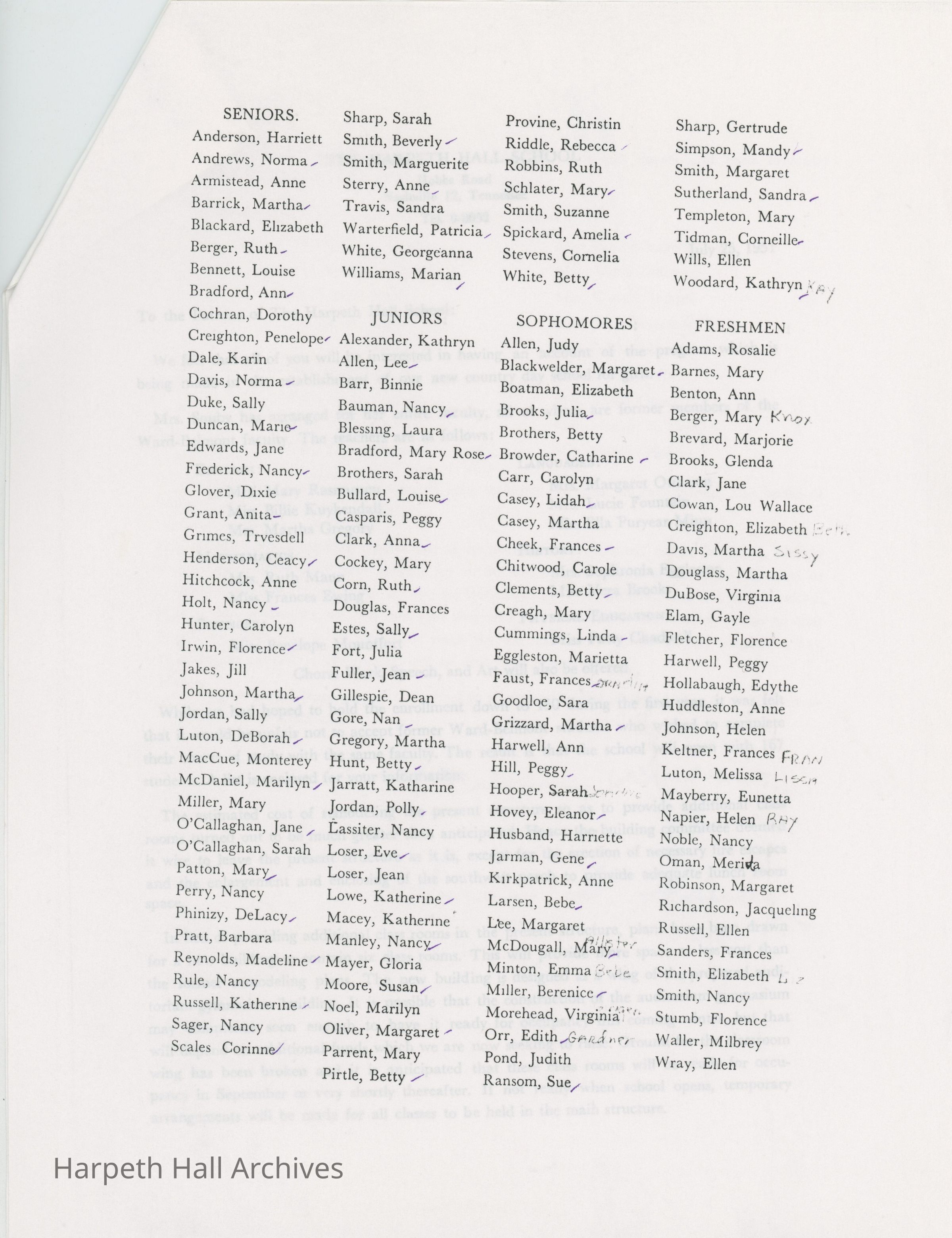 Harpeth Hall, 1951, William Waller, Susan Souby, Letter