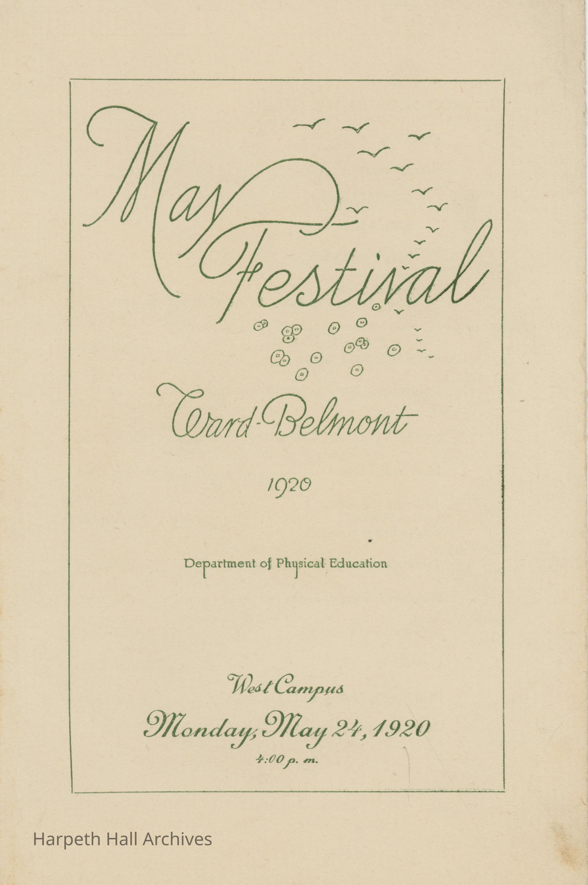 A program for the 1920 Ward-Belmont May Festival, presented by the Department of Physical Education. Held on the West Campus on Monday, May 24, 1920, at 4:00 P.M. The program consisted of four parts: a procession to the green, the presentation of the May Queen and her court, the festival entertainment and dancing (including the traditional May Pole Dance), and presentation of athletic medals and trophies. The 1920 May Queen was Lucy Green.Context