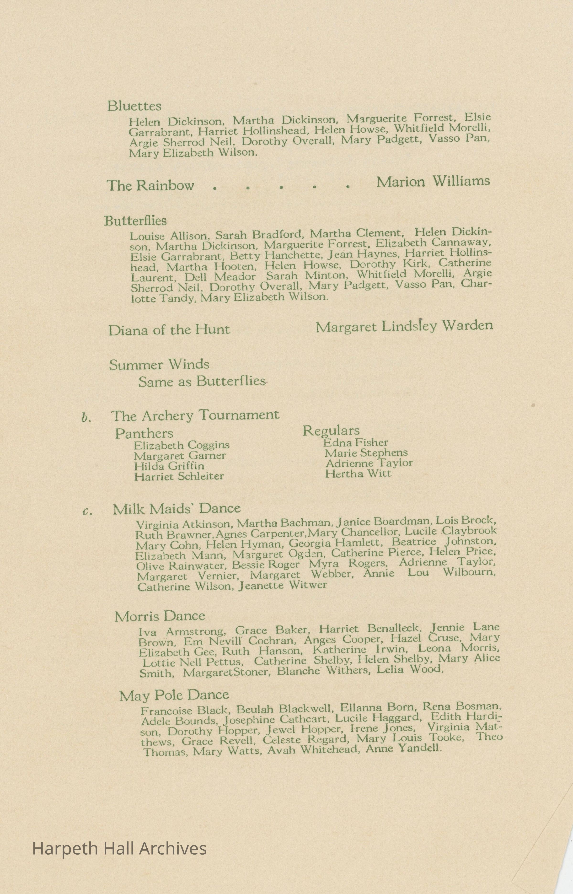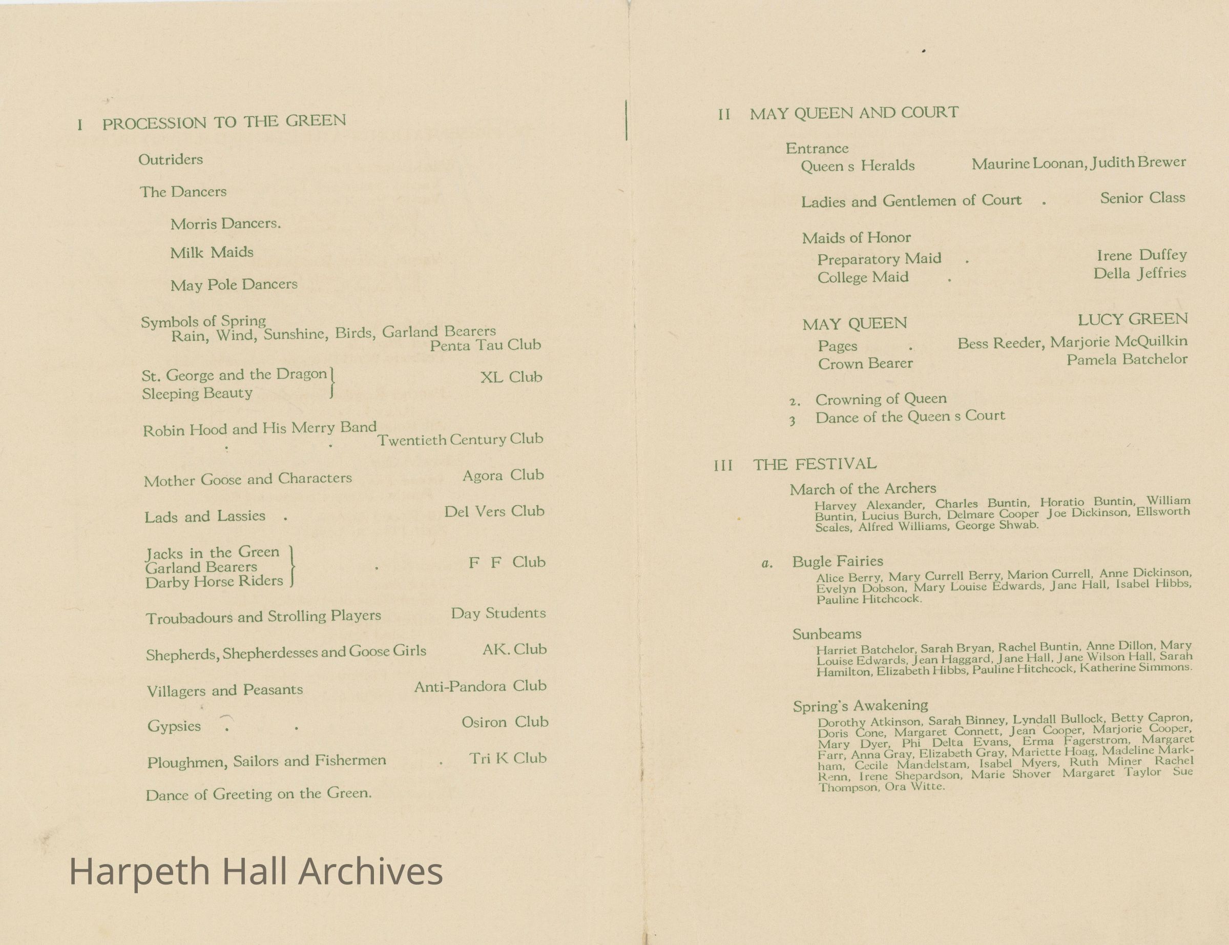 The annual May Day Festival was described as "the highlight of the social year at Ward-Belmont" (Milestones, 1945). The festivities involved dancing, processions, the crowning of the May Queen and her court, and the traditional May Pole Dance. The Lady of the Hall, Harpeth Hall's highest honor, evolved from the May Queen ceremony.Collection