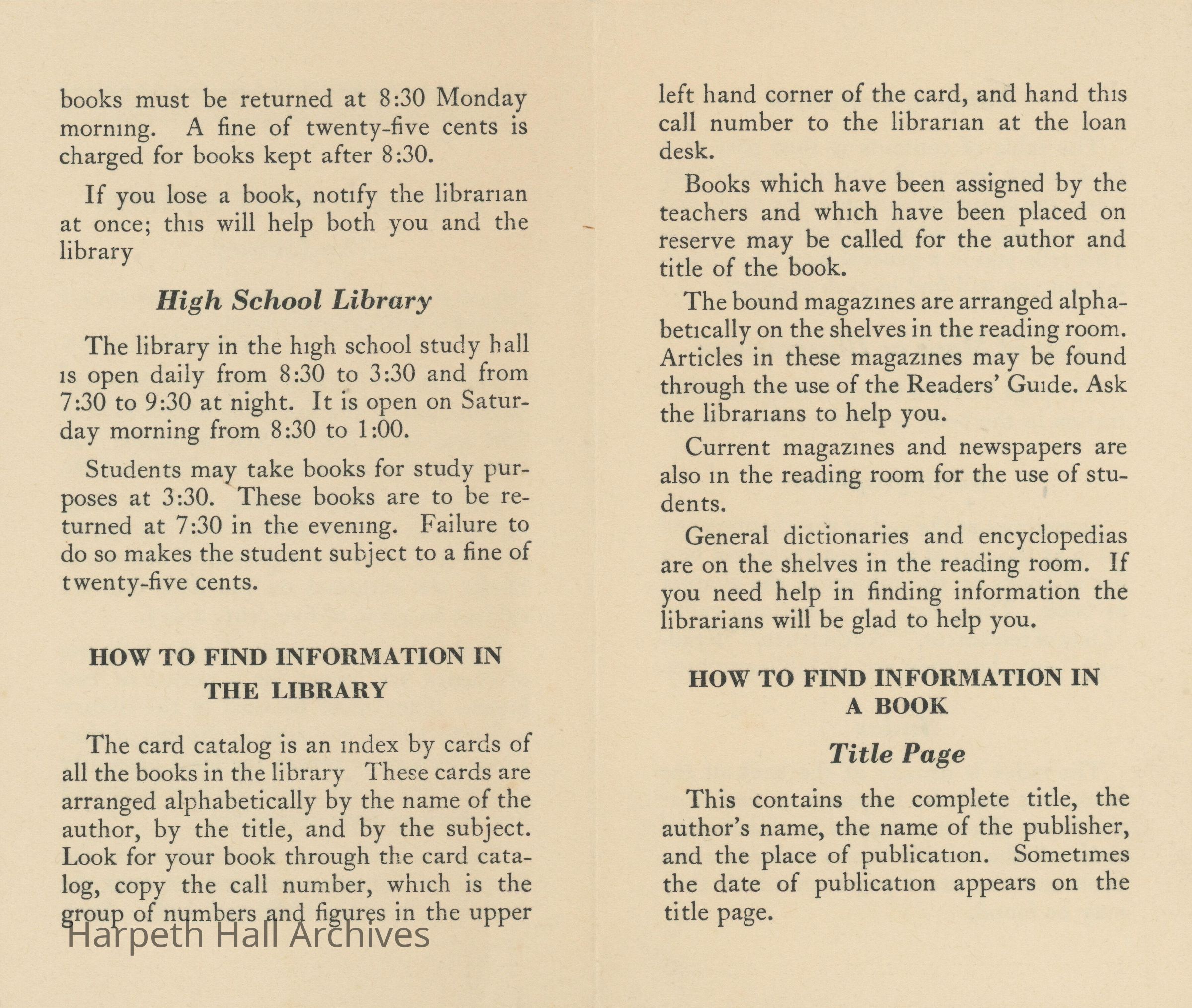 A small instructional booklet discussing the hours of operation and guidelines for checking out and returning books in both the main and high school libraries, as well as how to find information both in the library and in a particular book.Collection