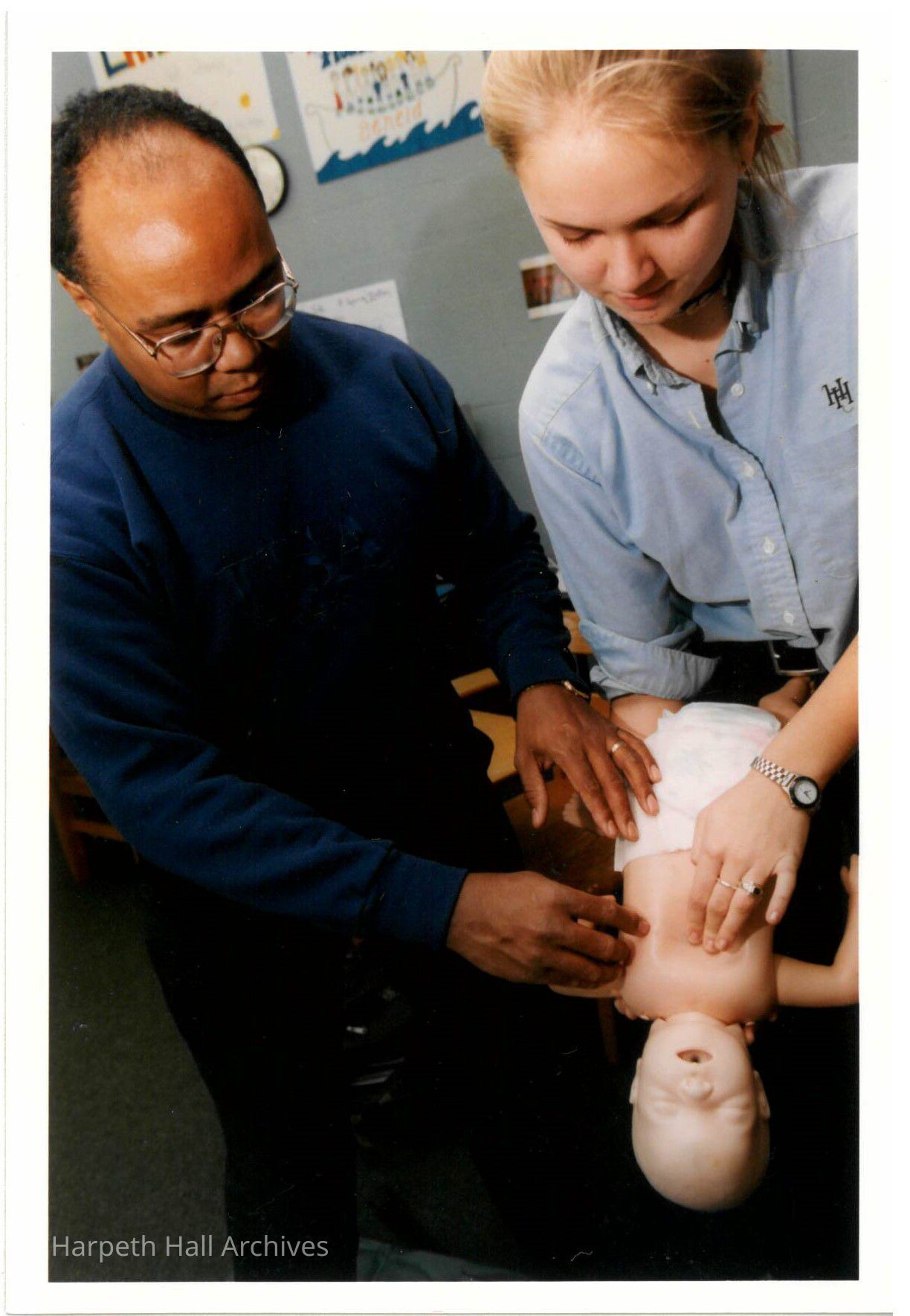 A photo of then-sophomore Lisa Shipp (class of 2001) working alongside an instructor to learn infant CPR during "The Lifetime Skills Class: CPR/Money Manager" course of Winterim 1999.