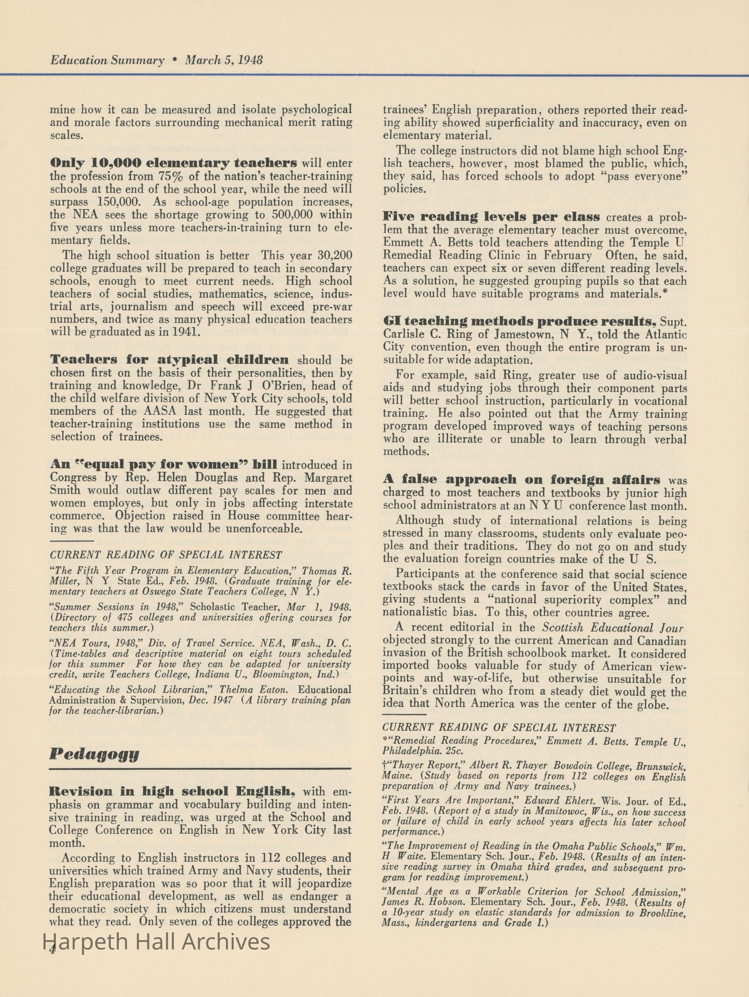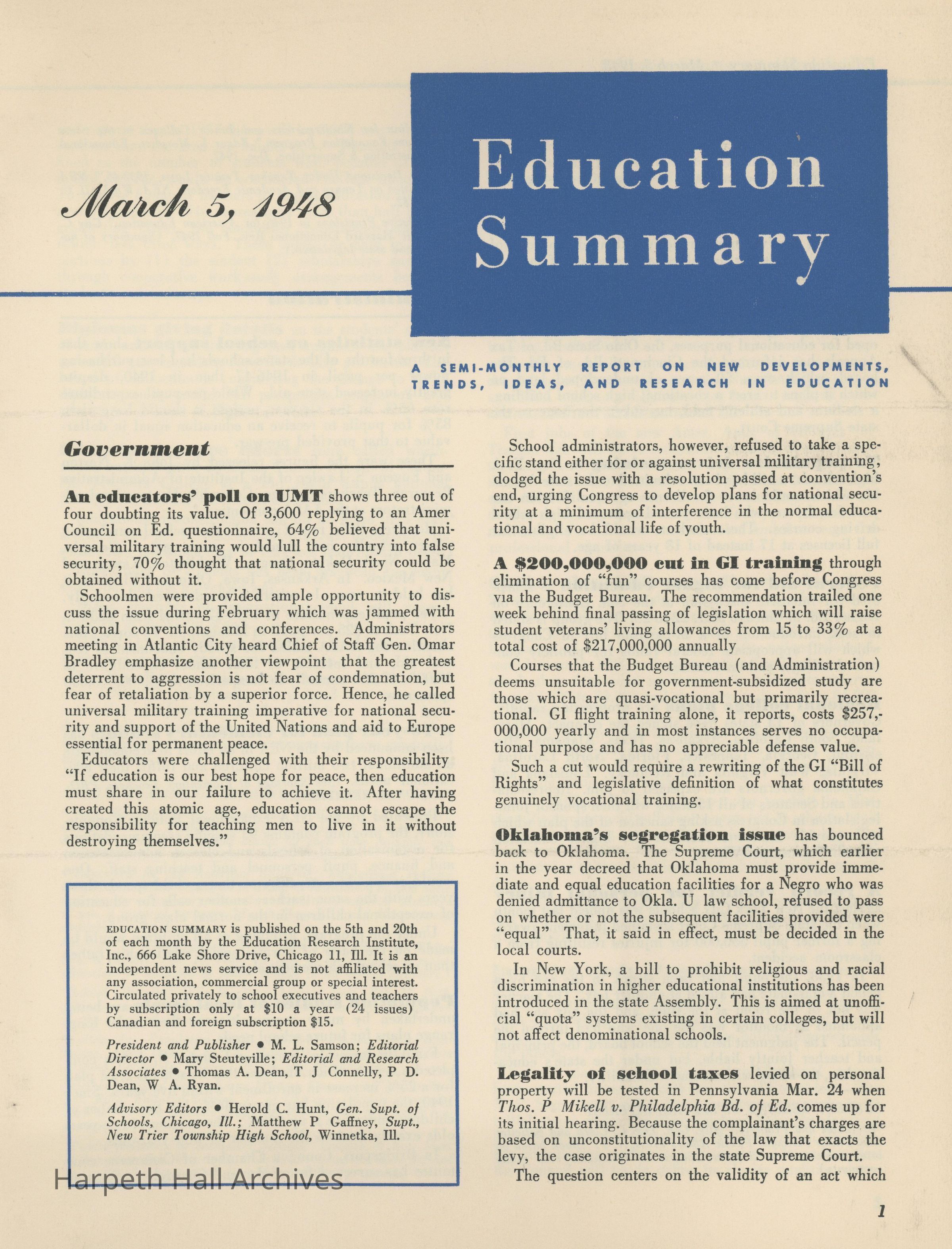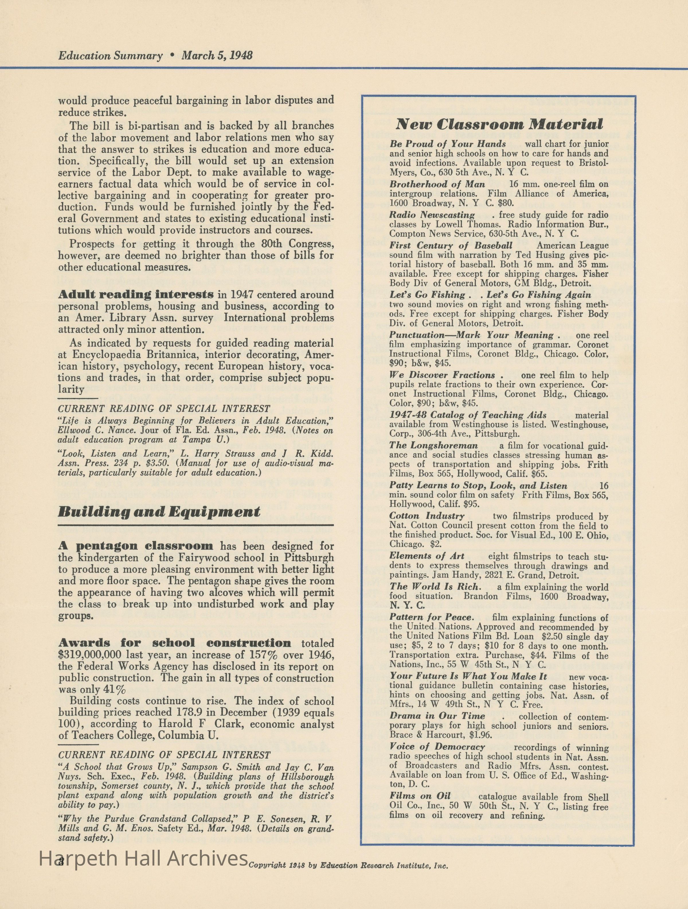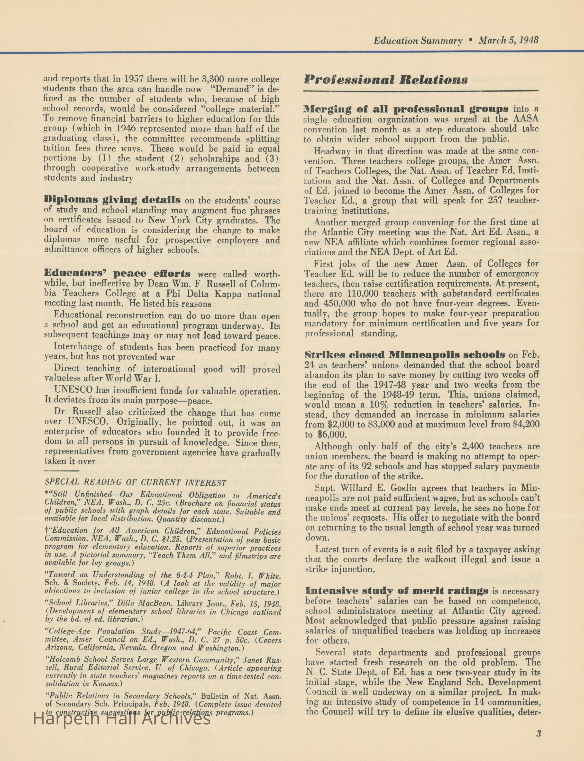 A semi-monthly report on new developments, trends, ideas, and research in education. The Education summary is dated March 5th, 1948.Collection