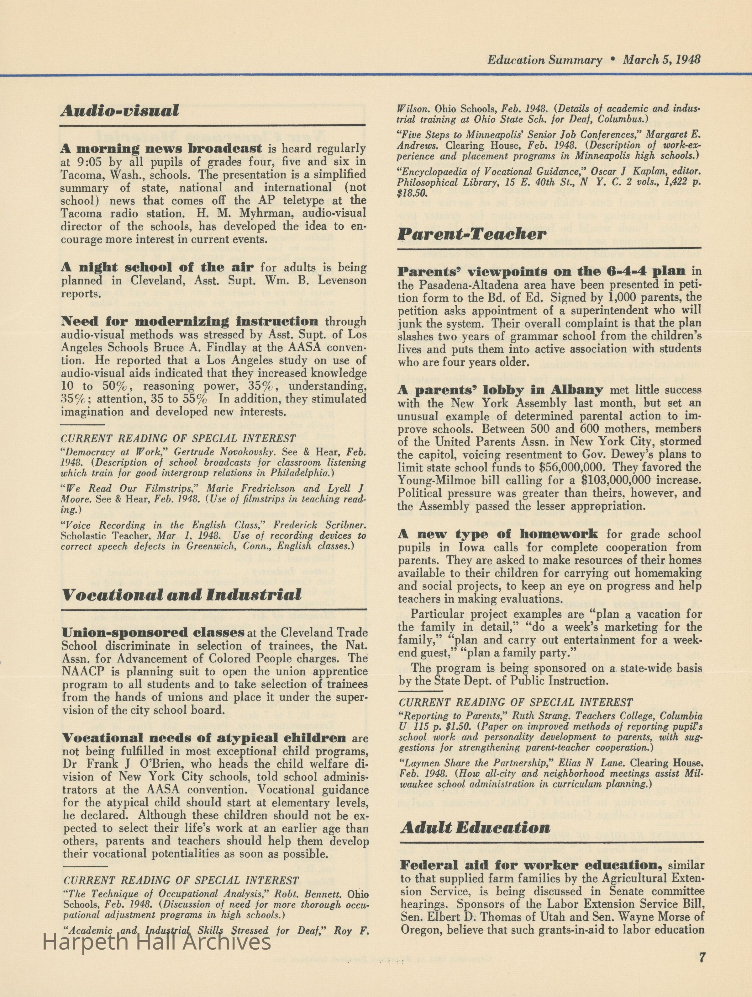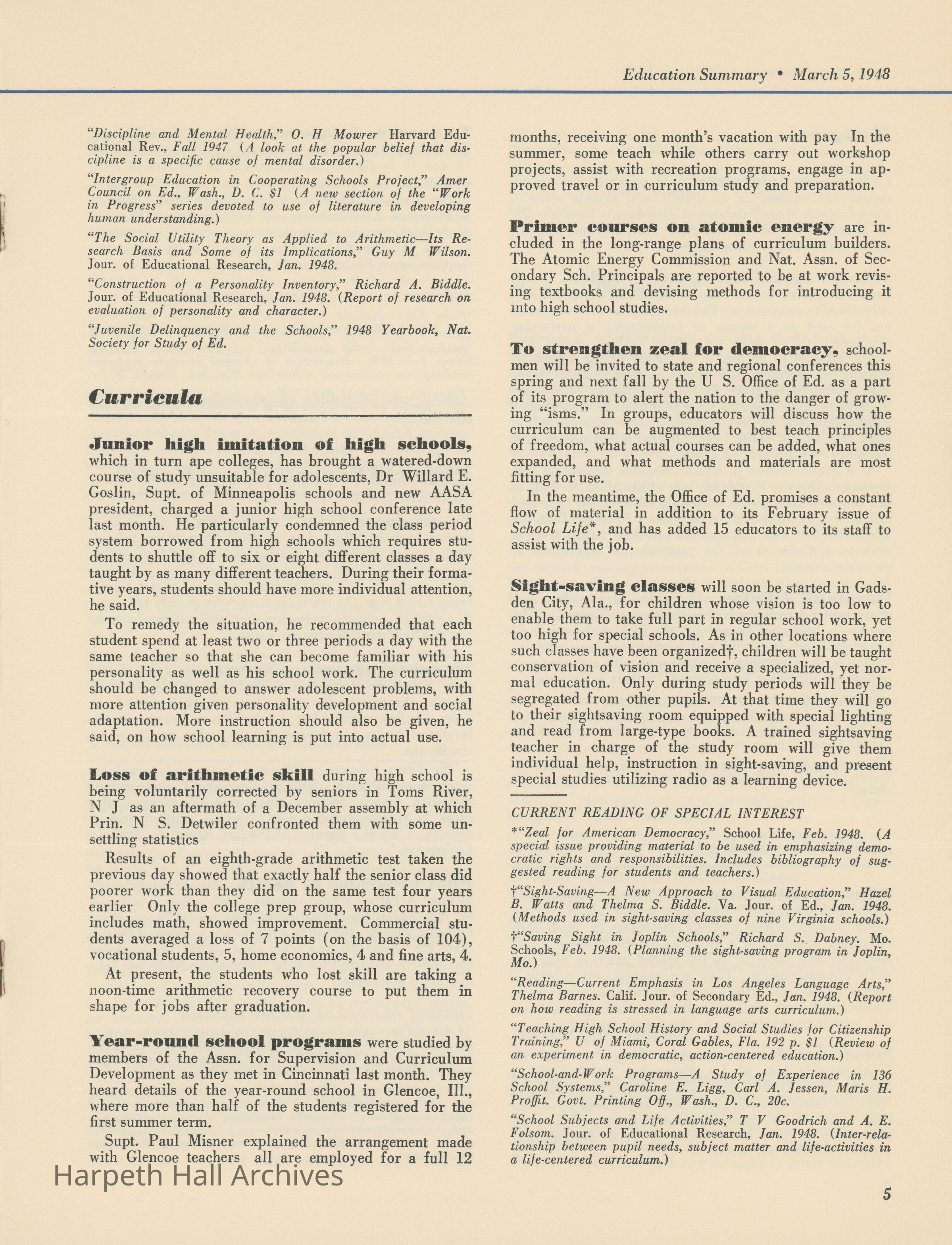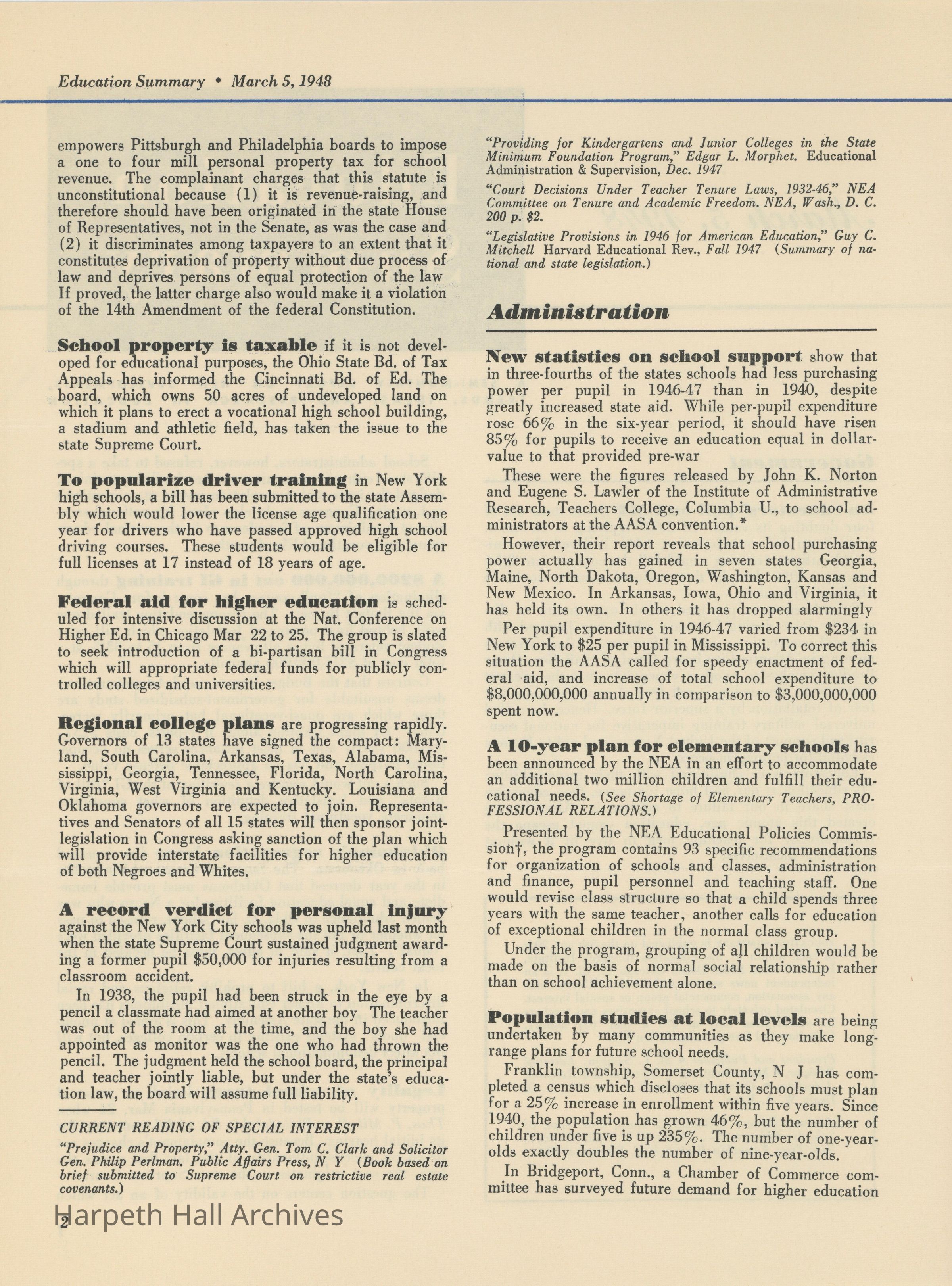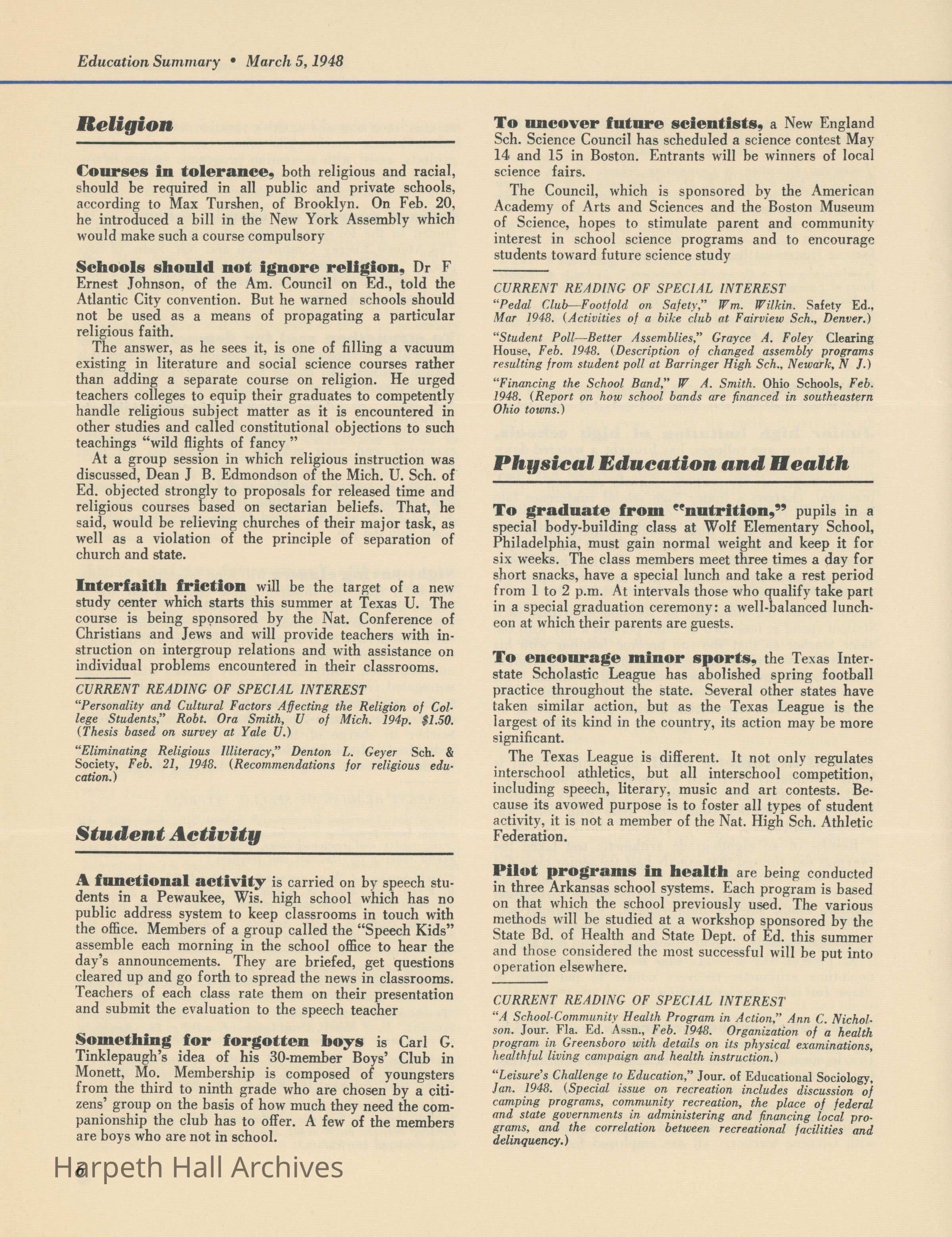 A semi-monthly report on new developments, trends, ideas, and research in education. The Education summary is dated March 5th, 1948.Collection