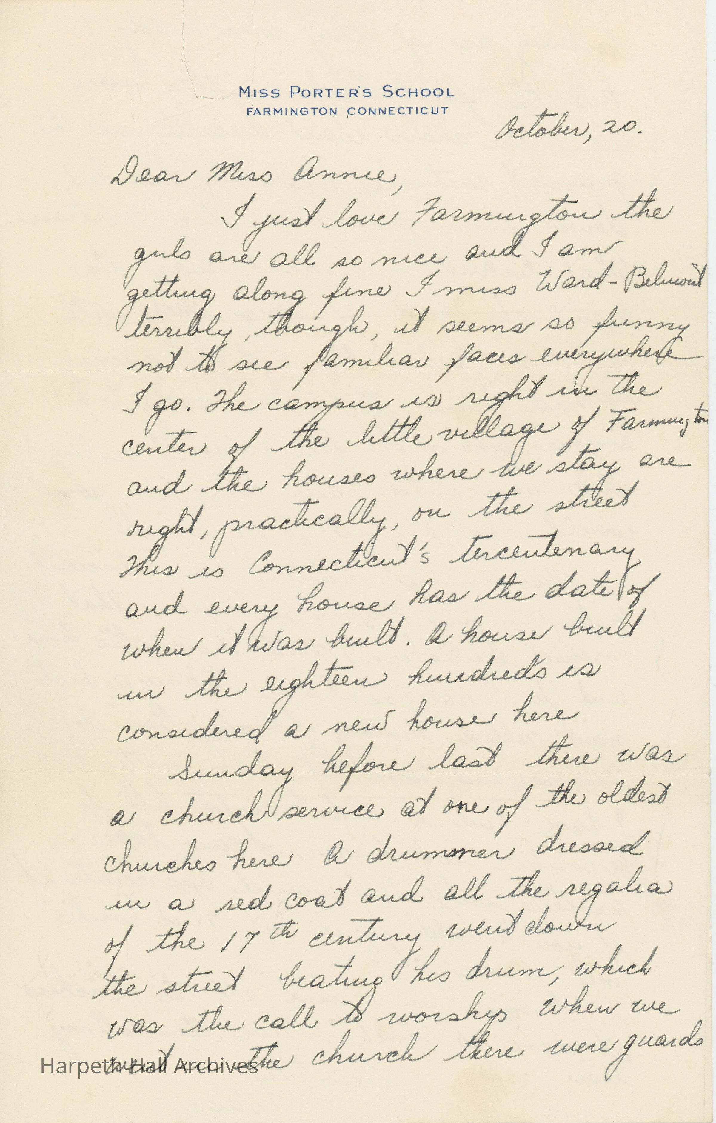 A letter addressed to Miss Annie Allison from another all-girls school, Miss Porter's School in Connecticut. The letter is dated October 20th.Context
