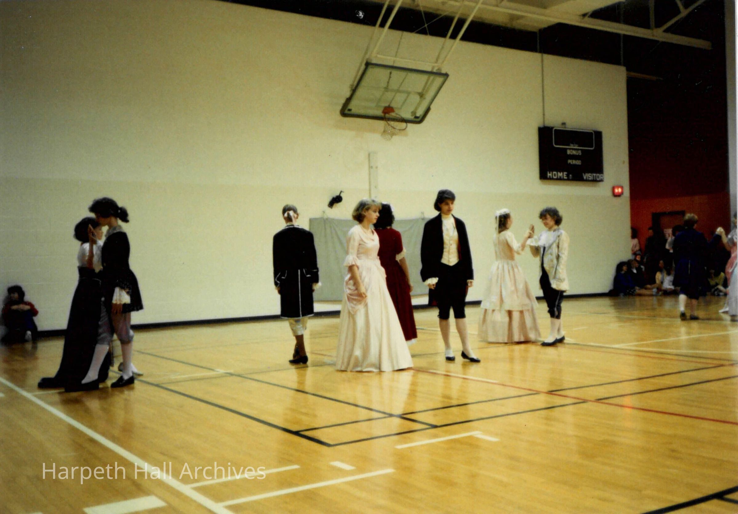 A group of seventh grade students performing in the George Washington Day Celebration. The photo is taken in the Morrison Gym in the McMurry Center.Context