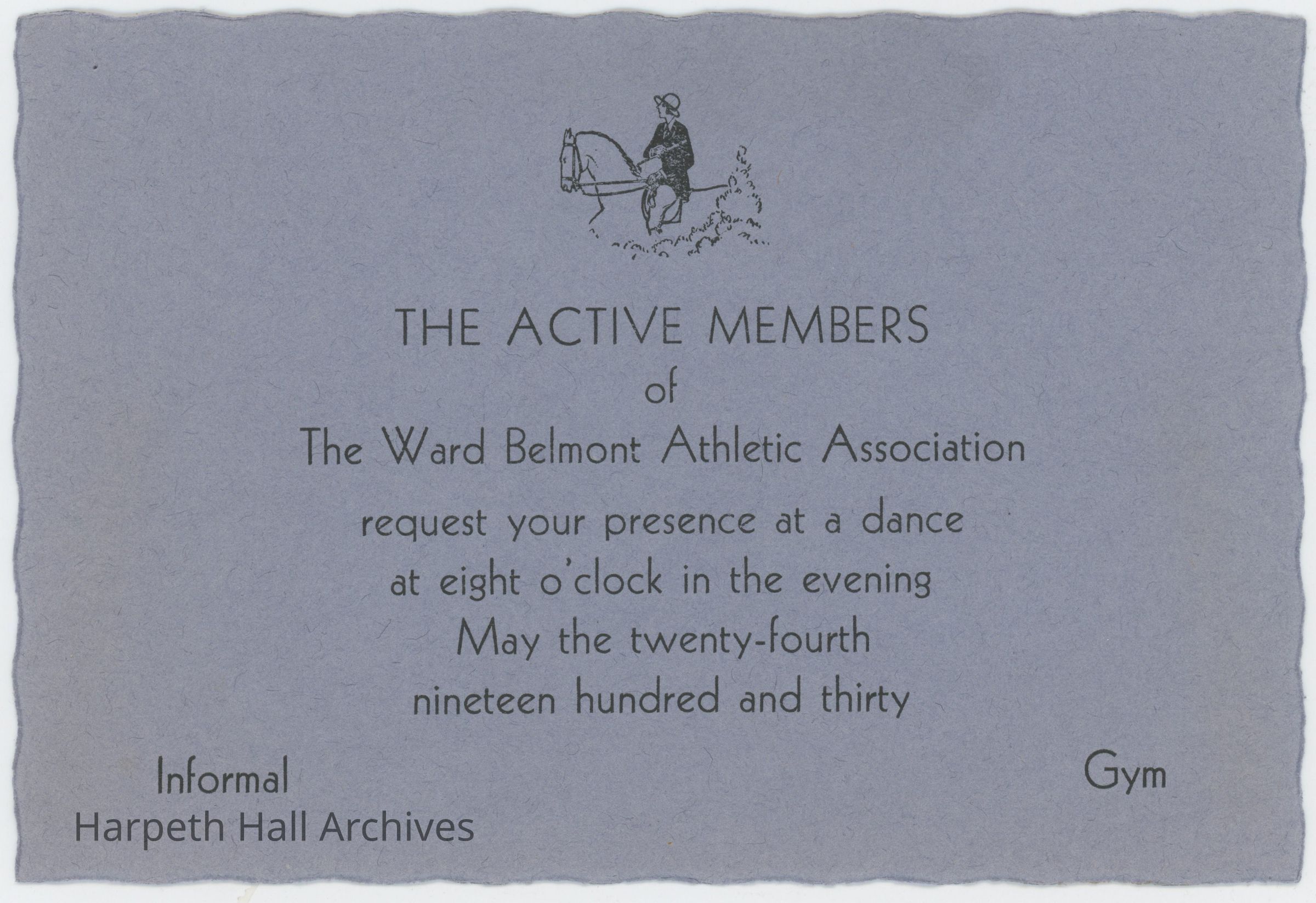 An invitation, addressed to Miss Jane Sutherland, from the active members of the Ward-Belmont Athletic Association requesting her presence at a dance at 8:00 in the evening on May 24, 1930. The dance was informal and held in the school gym.Context