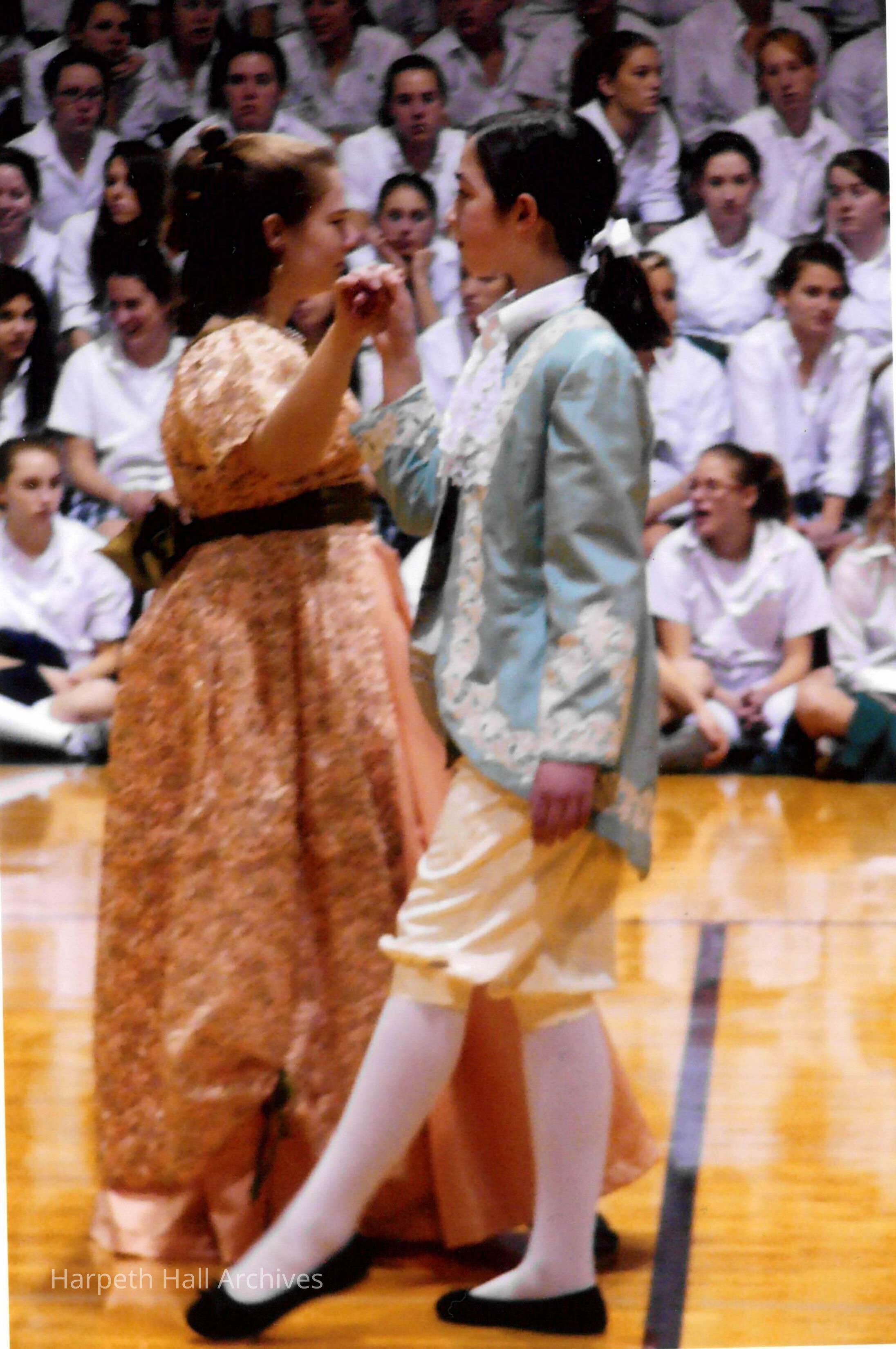 Seventh grade students performing a dance in the George Washington Day Celebration. The photo is taken in the Morrison Gym in the McMurry Center.