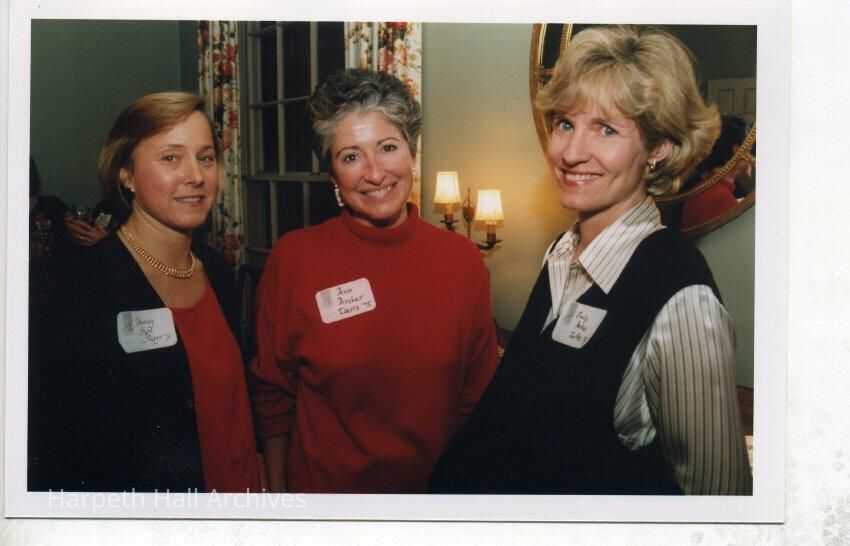 from left to right: Nancy Short Phipps (1975), Ann Archer Davis (1975), and Emily Perkins Zerfoss (1975) at the 1998 Alumnae Holiday Party