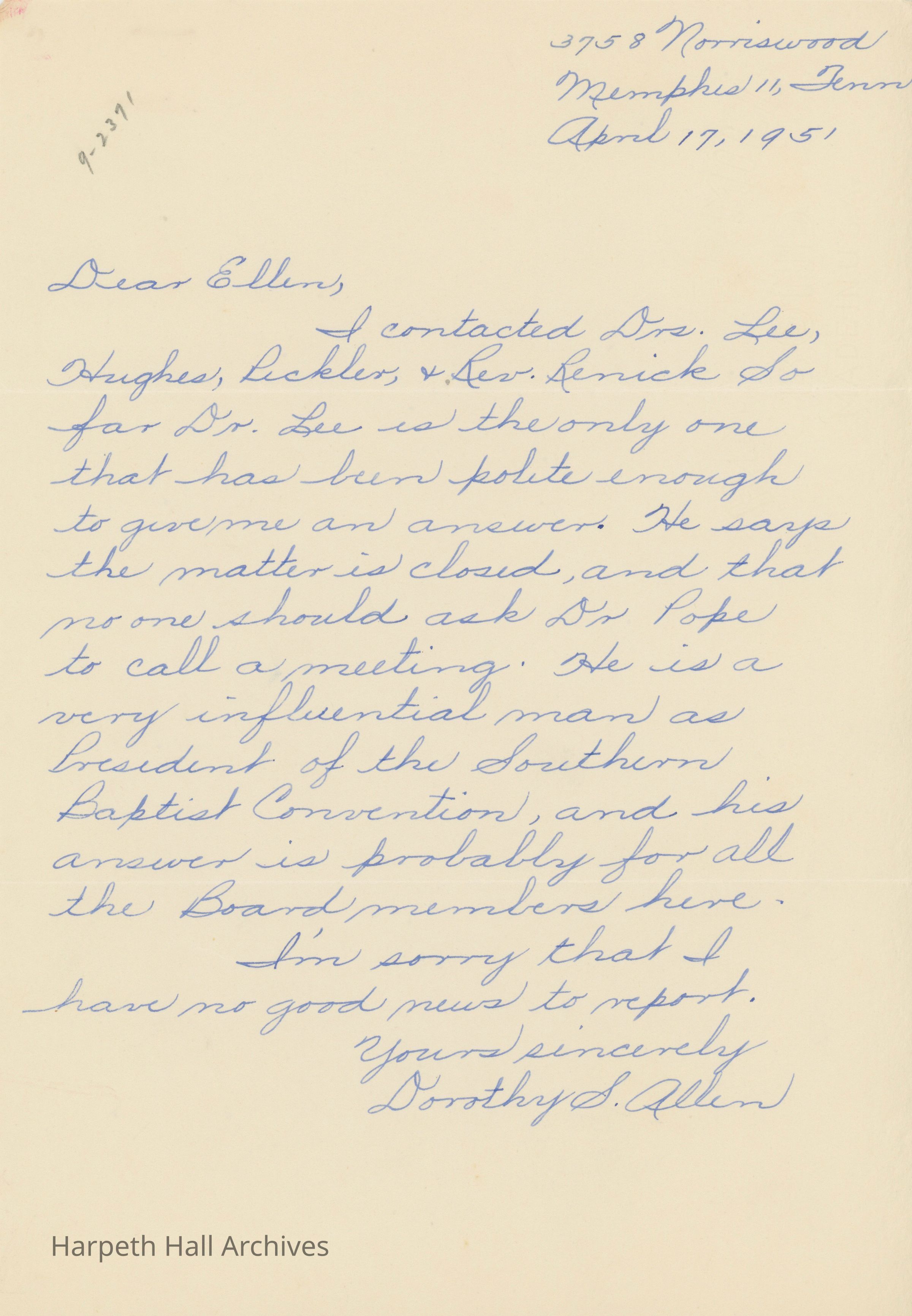 Letter From Dorothy Allen, April 1951Entry/Object ID