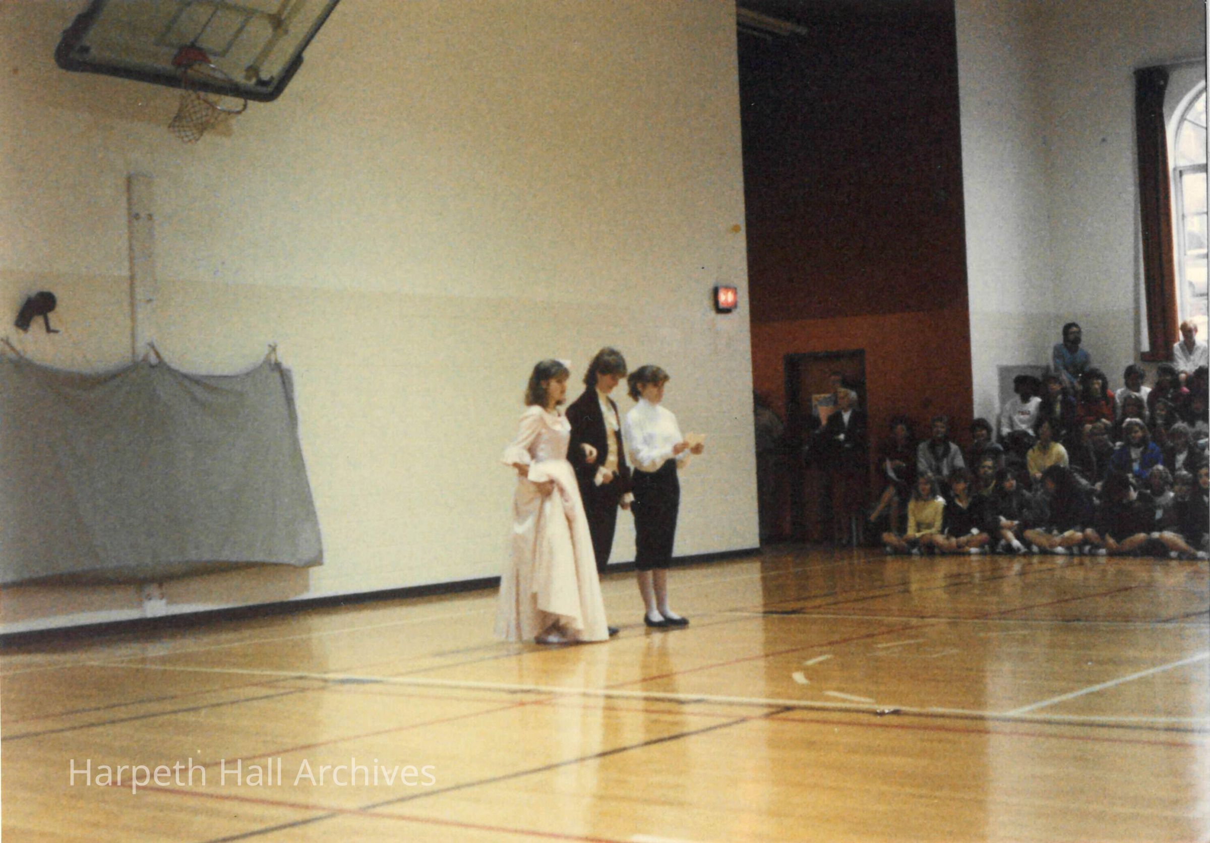 Two students dressed as a lady and a gentleman entering as the Pages introduce them during the George Washington Day Celebration. The photo is taken in Morrison Gym in the McMurry Center.Context