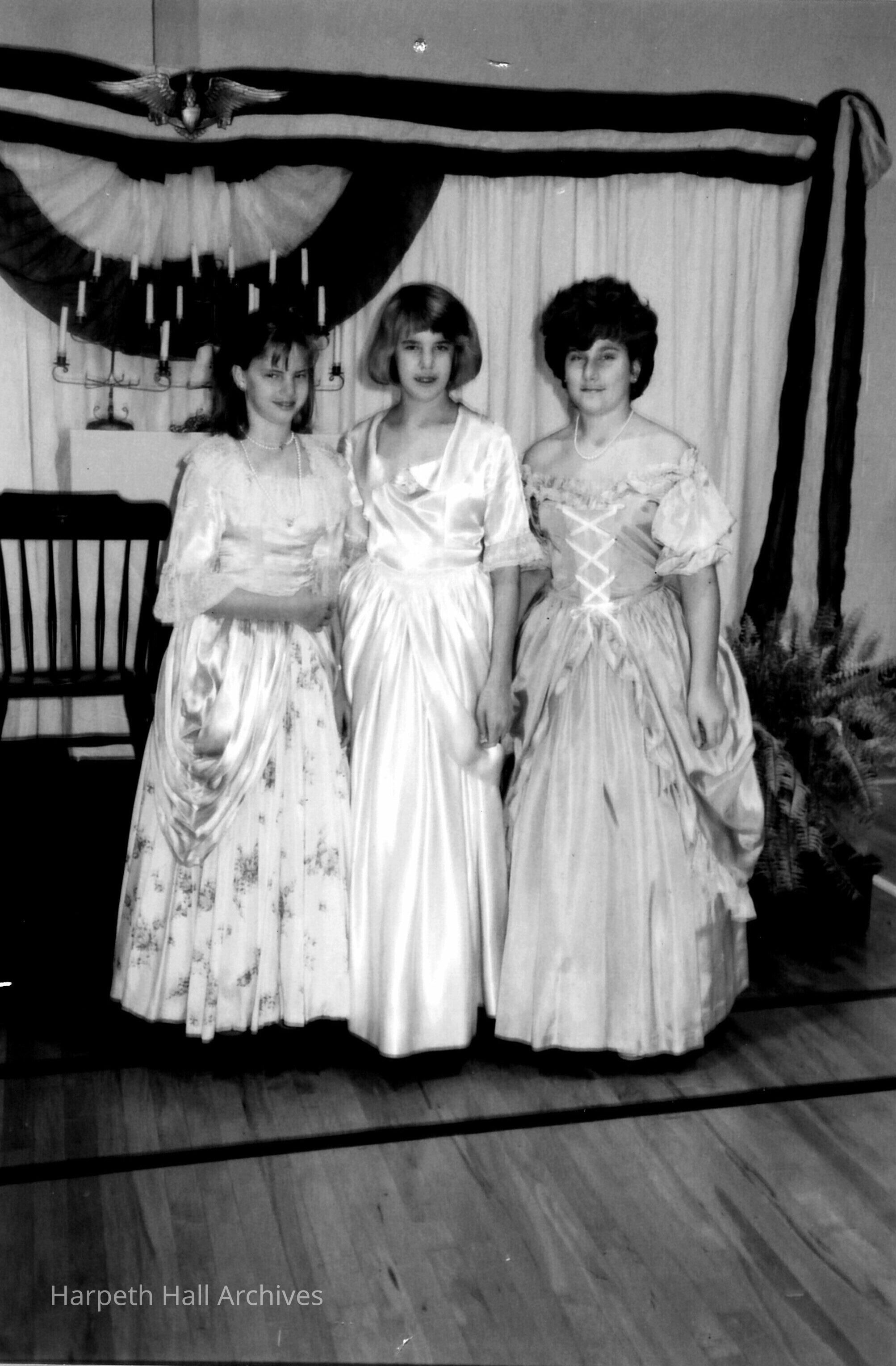 Three students posing in lady costumes for the George Washington Day Celebration.Context