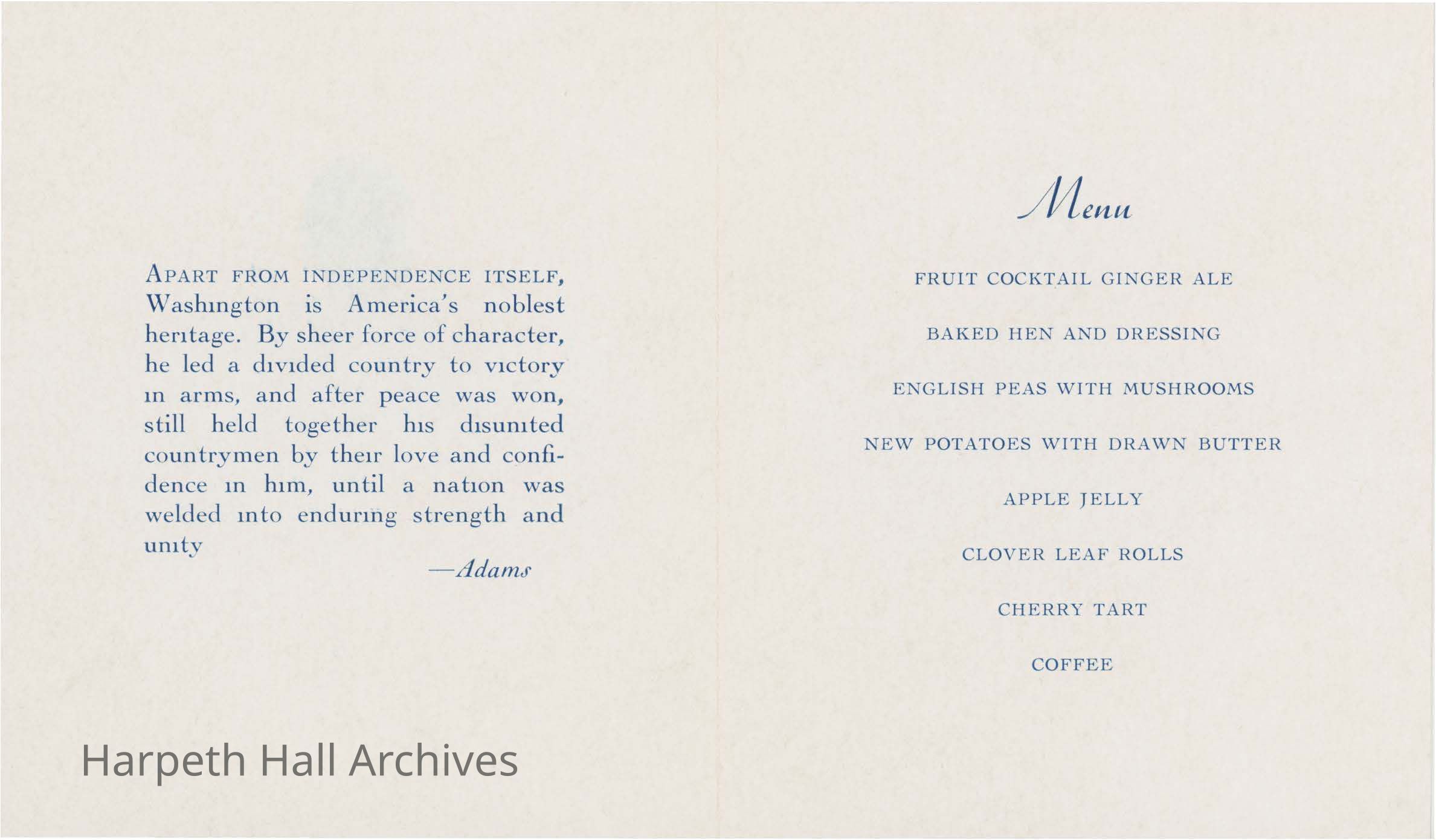 Dinner menu with quote by Adams about George Washington