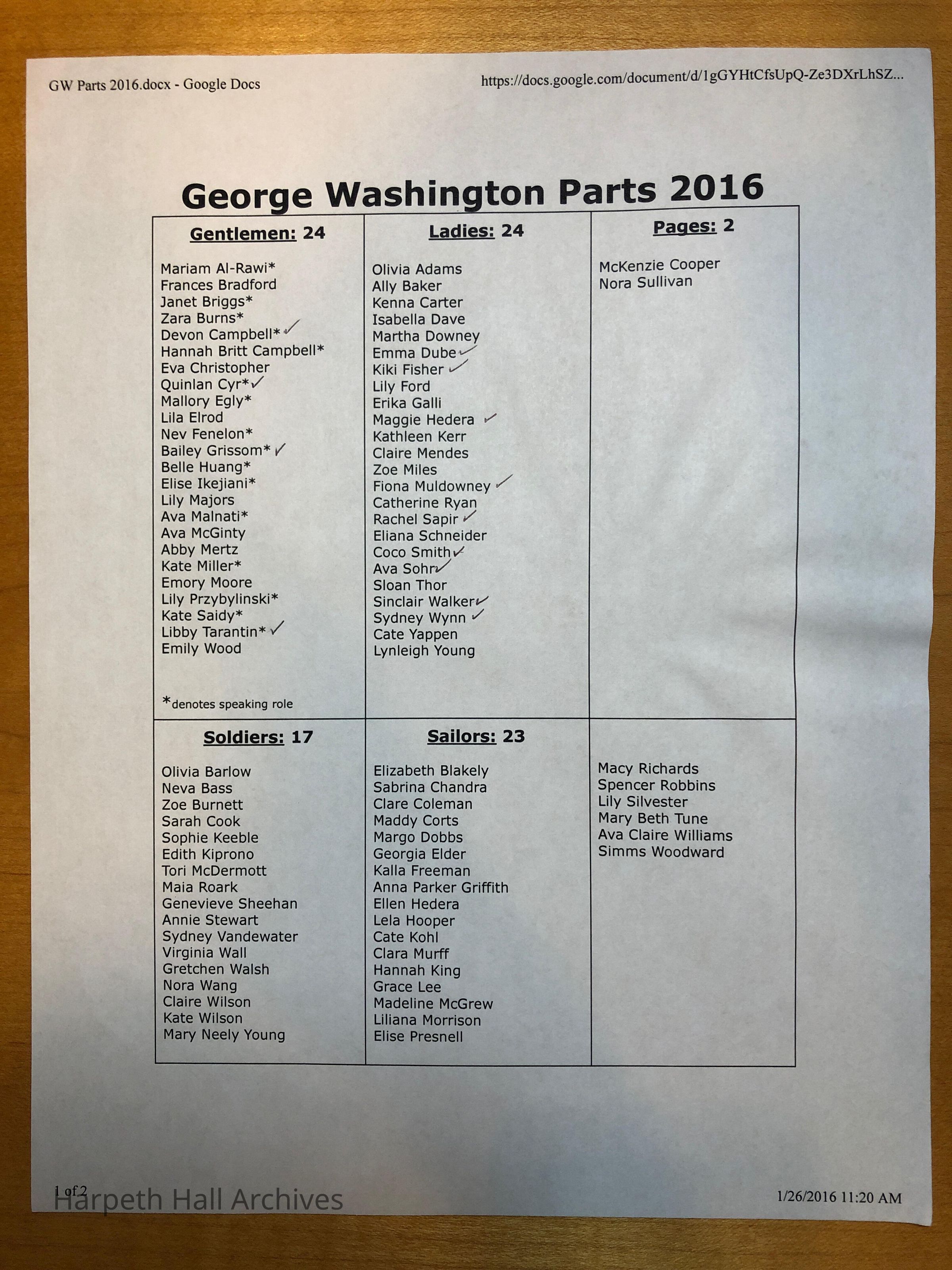 The list of roles for the George Washington Day Celebration in 2016 put on by the class of 2021 when they were in seventh grade.Context