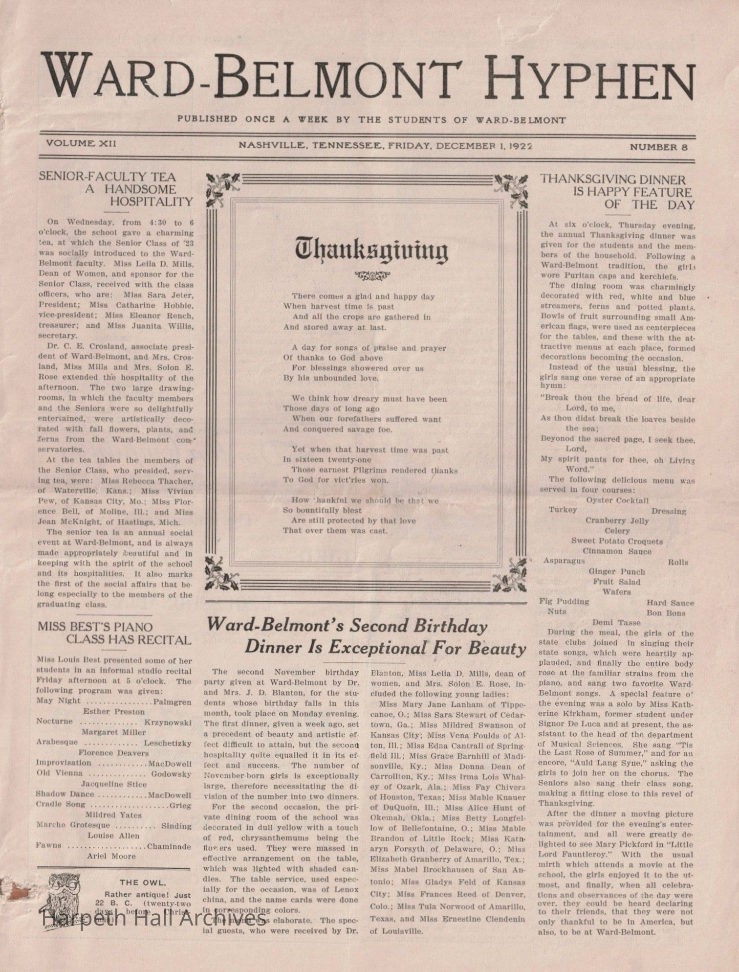 The Volume XII, Number 8 edition of the Ward-Belmont Hyphen, published Friday, December 1, 1922.Context
