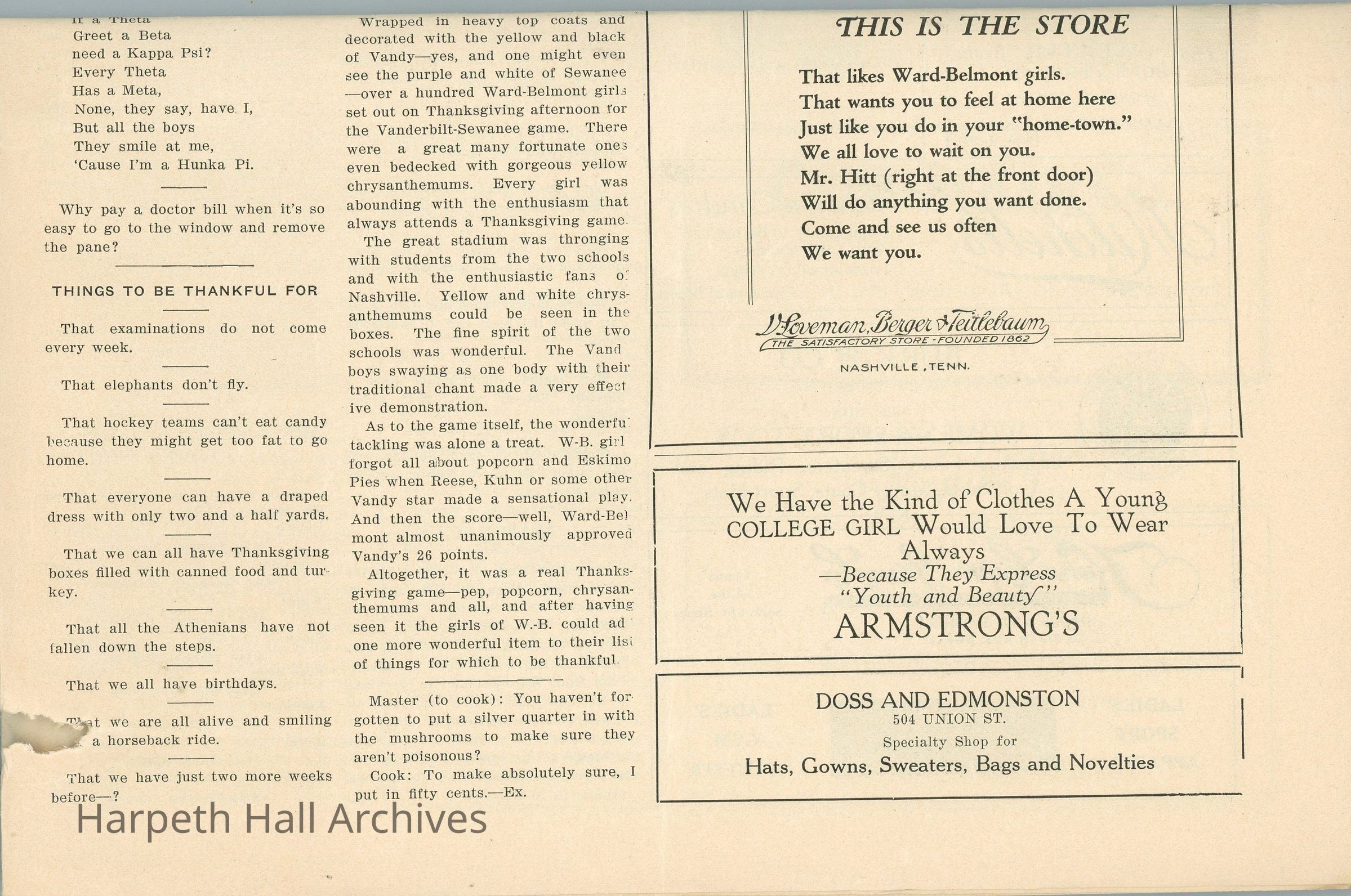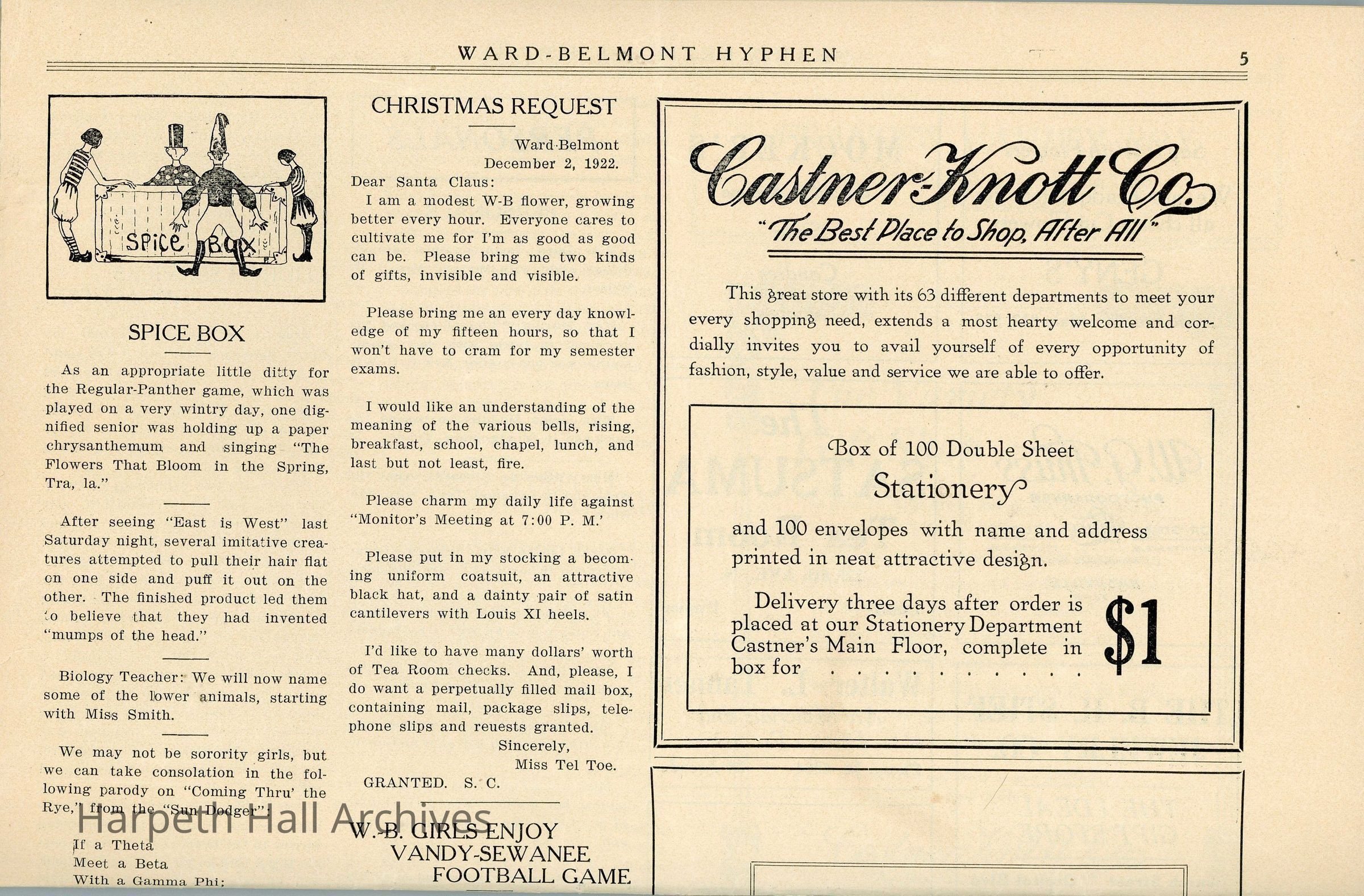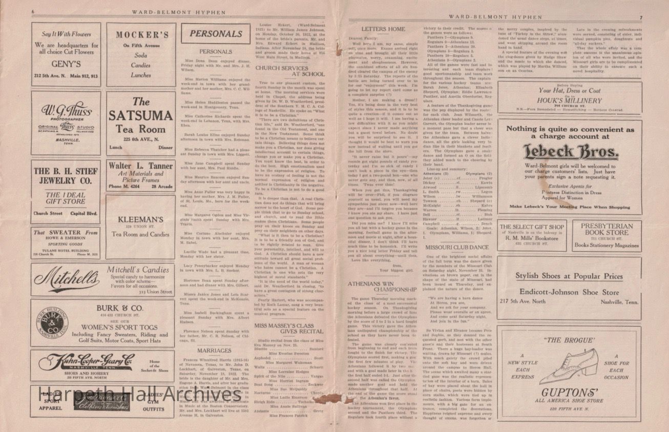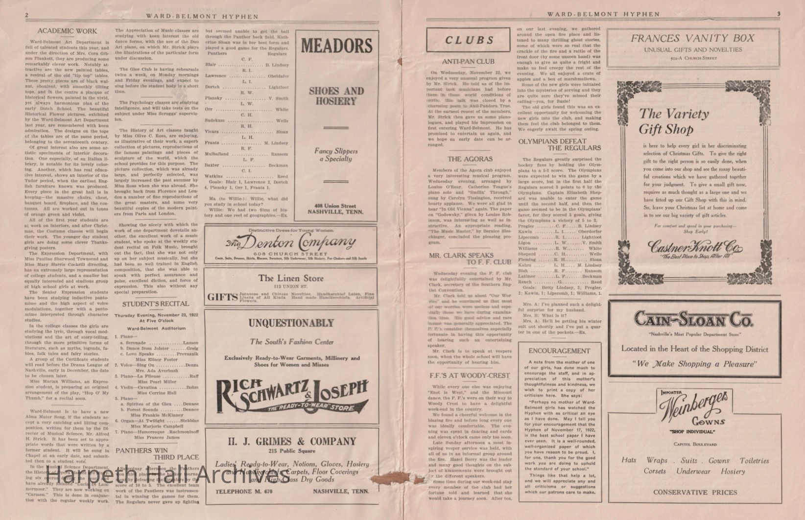 The Ward-Belmont Hyphen was the school's weekly student newspaper. It was named in honor of the merger of Ward's Seminary and Belmont College, resulting in the combined name Ward-Belmont. Students served as reporters, editors, copy readers, etc. The newspaper also included multiple advertisements for local businesses.Collection
