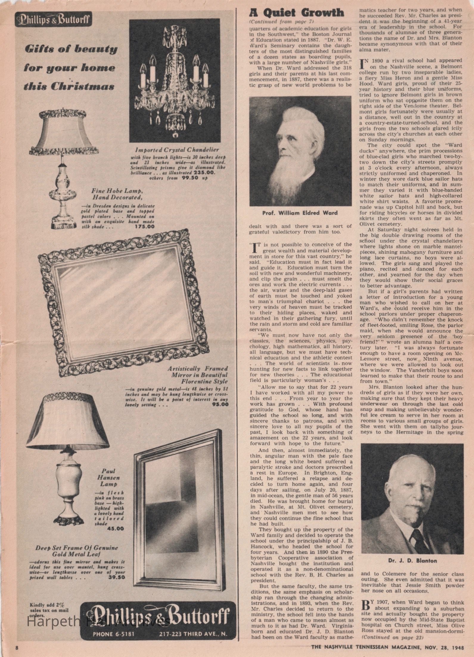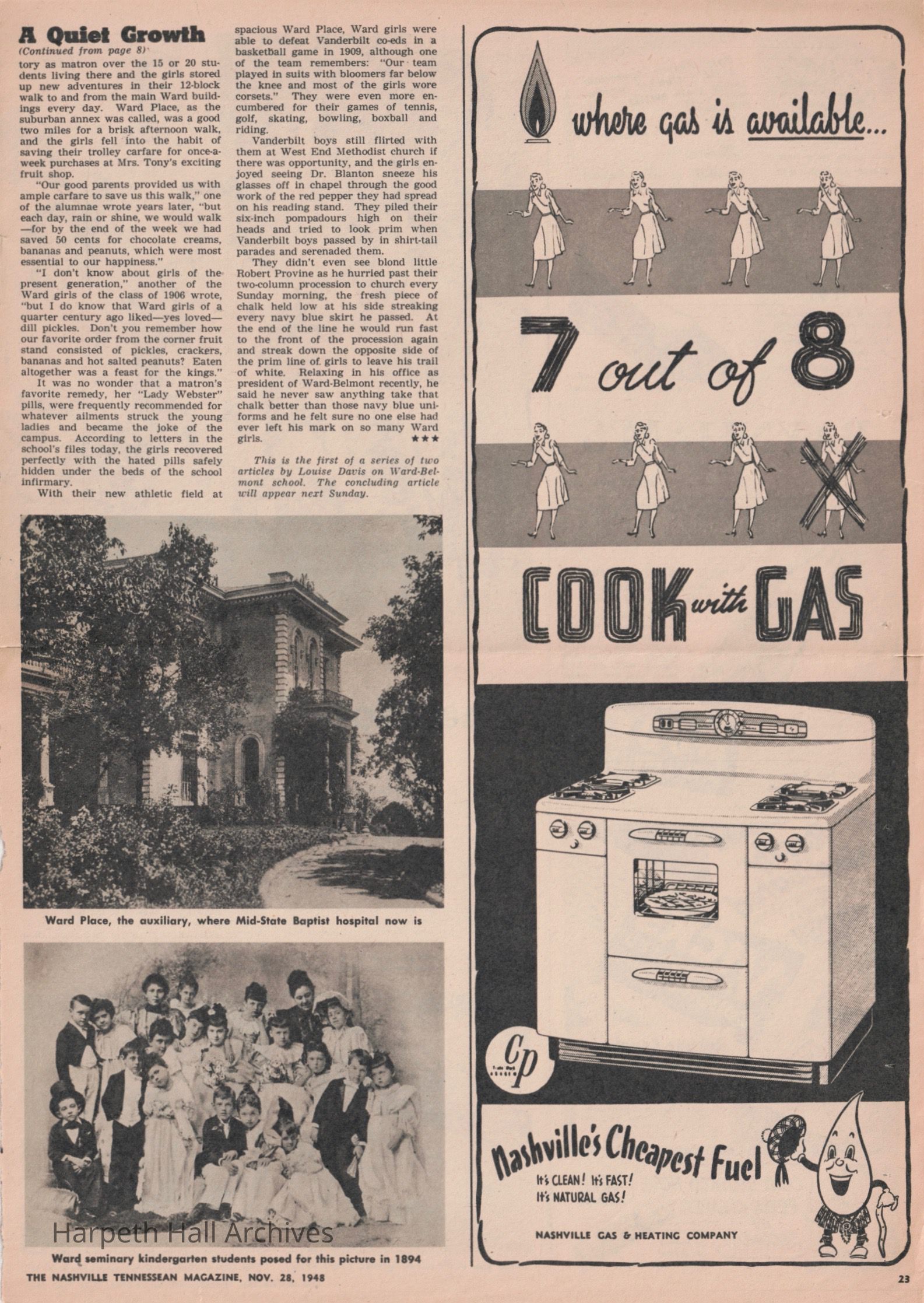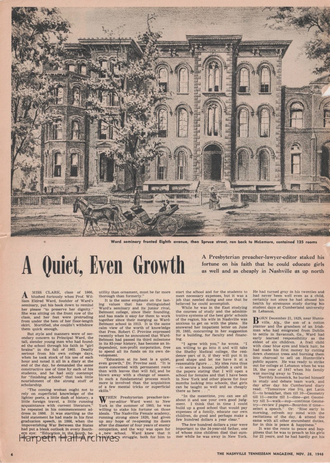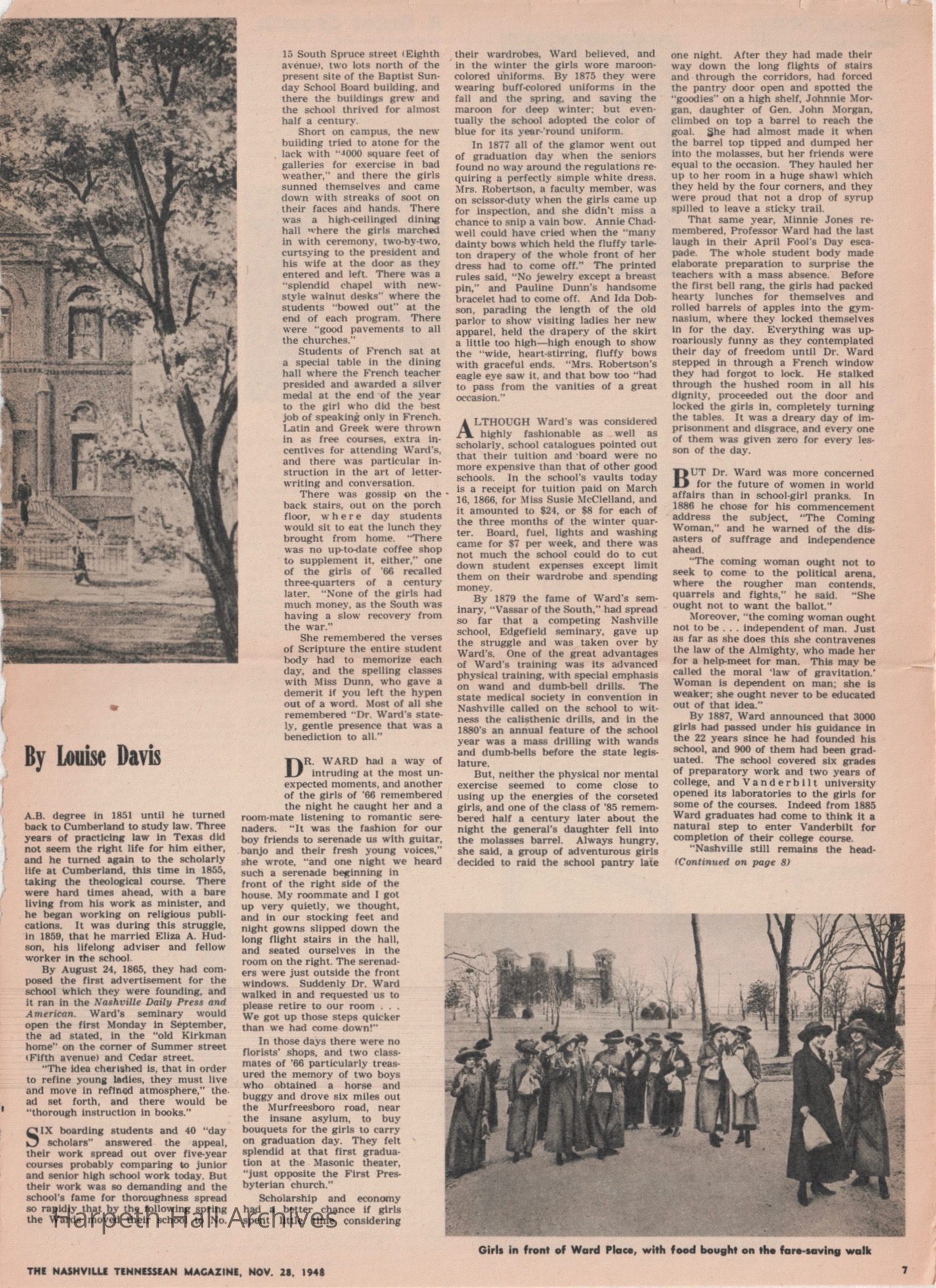 Newspaper article in the November 28, 1948 Tennessean newspaper on the founding of Ward's Seminary and its later merge with Belmont to create Ward-Belmont. Written by Louise Davis.Collection
