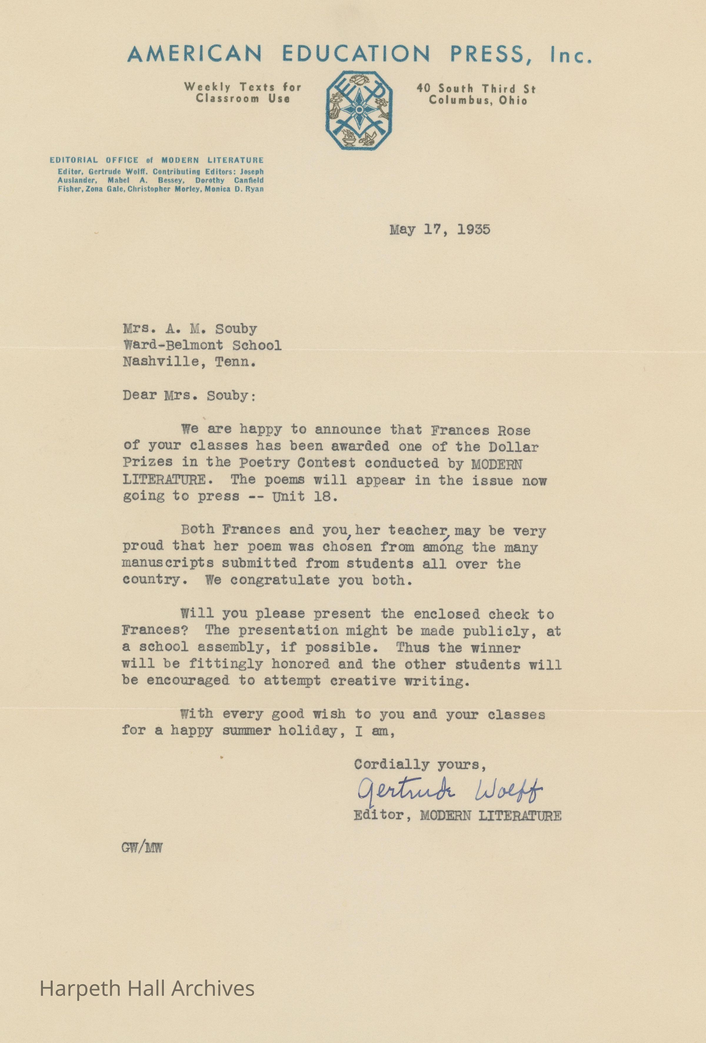 A letter addressed to Mrs. Susan Souby informing her of a student that won a writing award. The letter is dated May 17th, 1935.Context