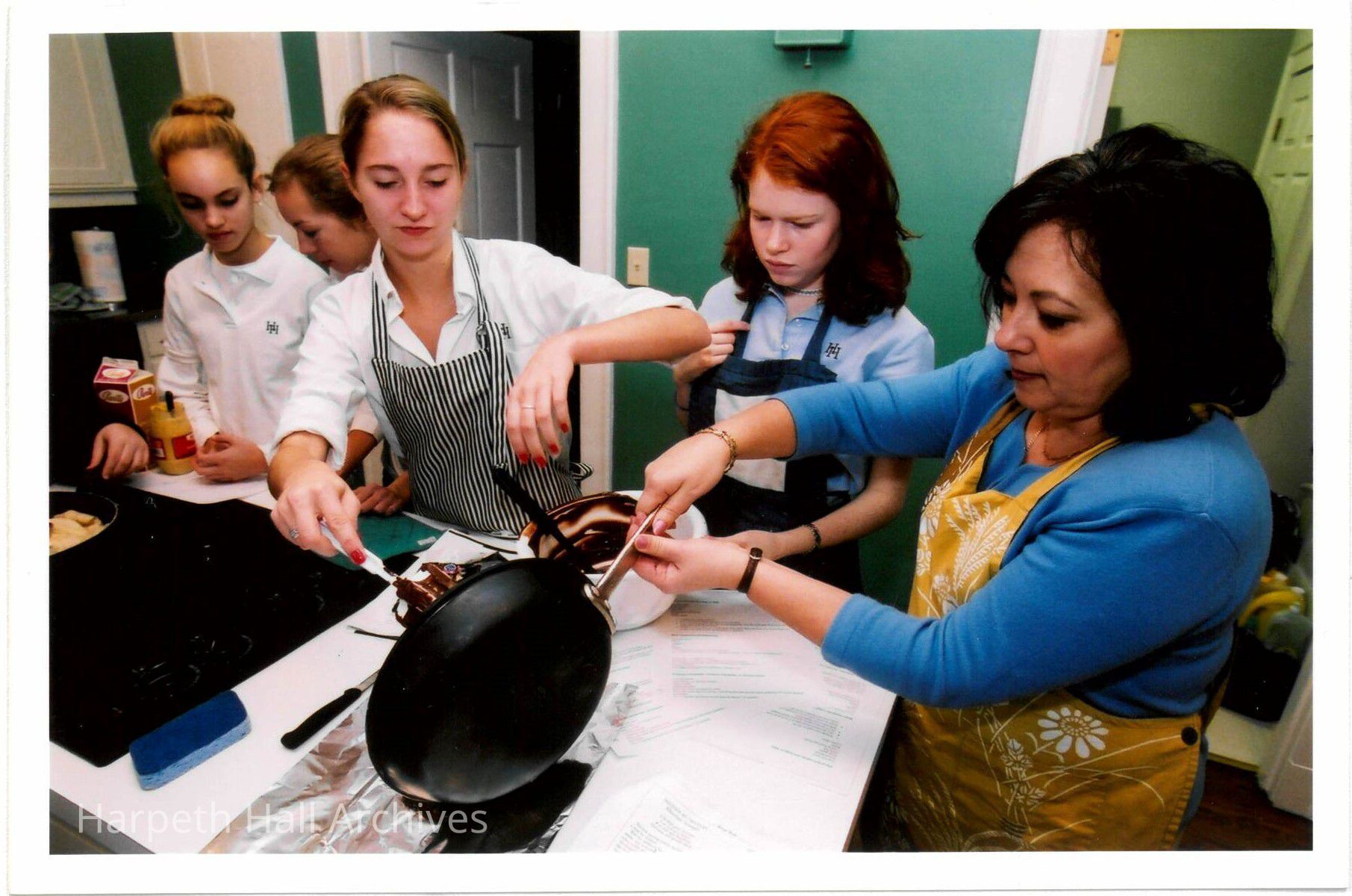 A photograph of Harpeth Hall students cooking during a Winterim class sometime in the 2000s. Per the 2000-2006 Winterim course catalogs, several courses were offered that provided students the opportunity to cook: a course on Hungary (students learned to cook Hungarian goulash), many French cooking and culture courses, a course entitled The Science of Food and Cooking, and a course on the connections between Japanese and Mediterranean cuisines.