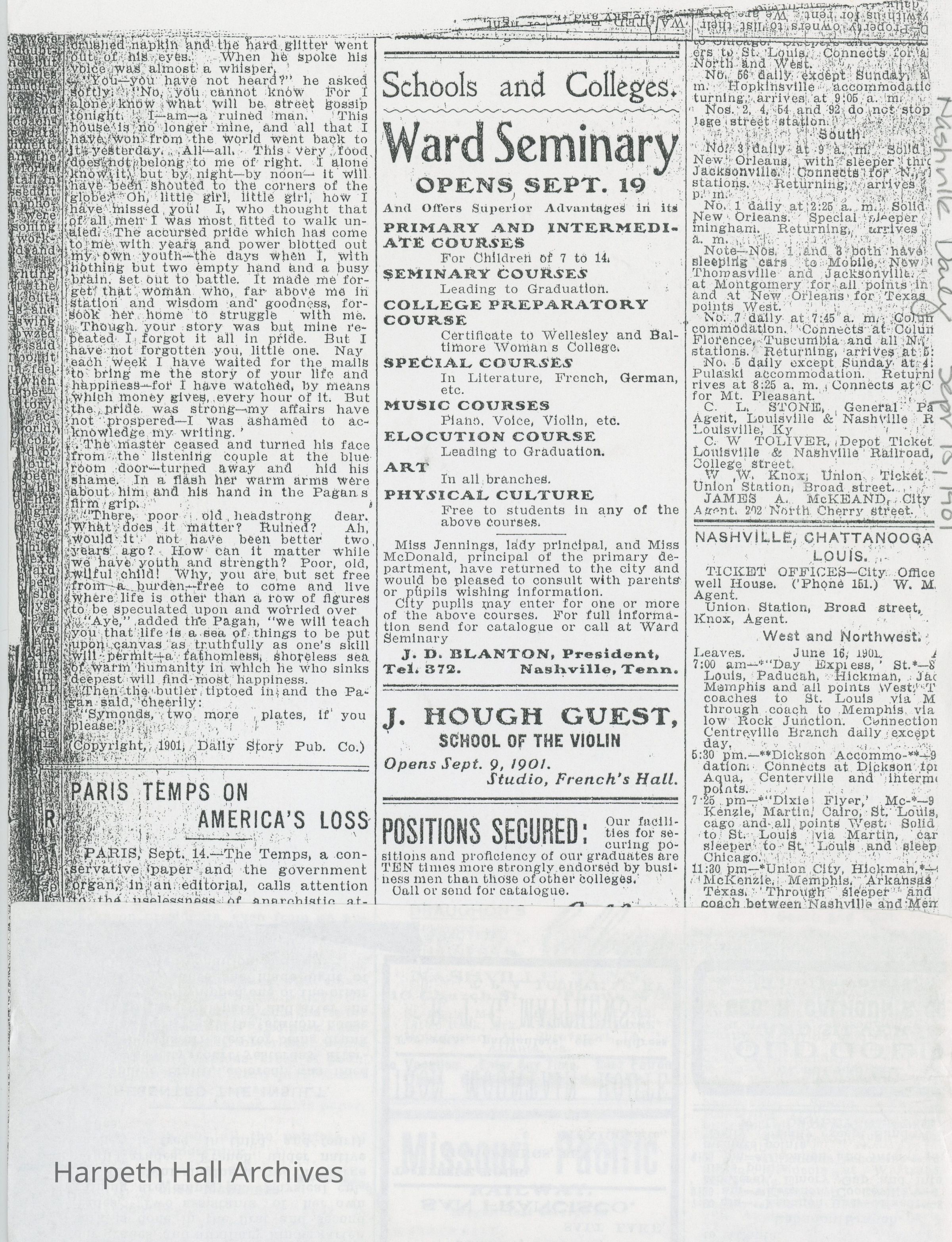 Ward Seminary, Newspaper, Advertisement, 1901, Nashville Daily, J. D. Blanton