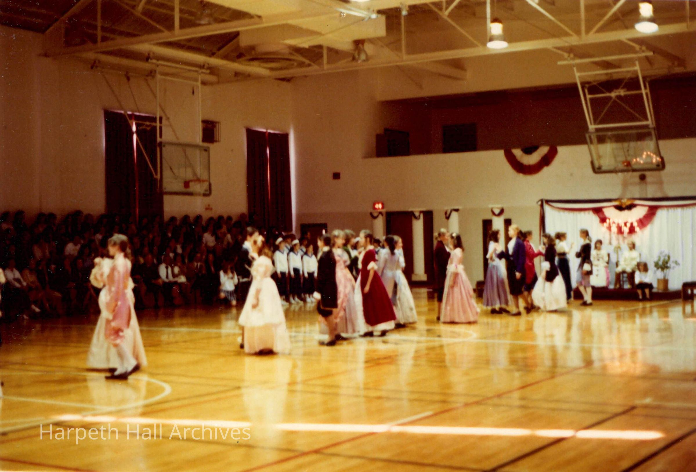 A group of seventh grade students performing a dance in the George Washington Day Celebration. The photo is taken in Morrison Gym in the McMurry Center.Context