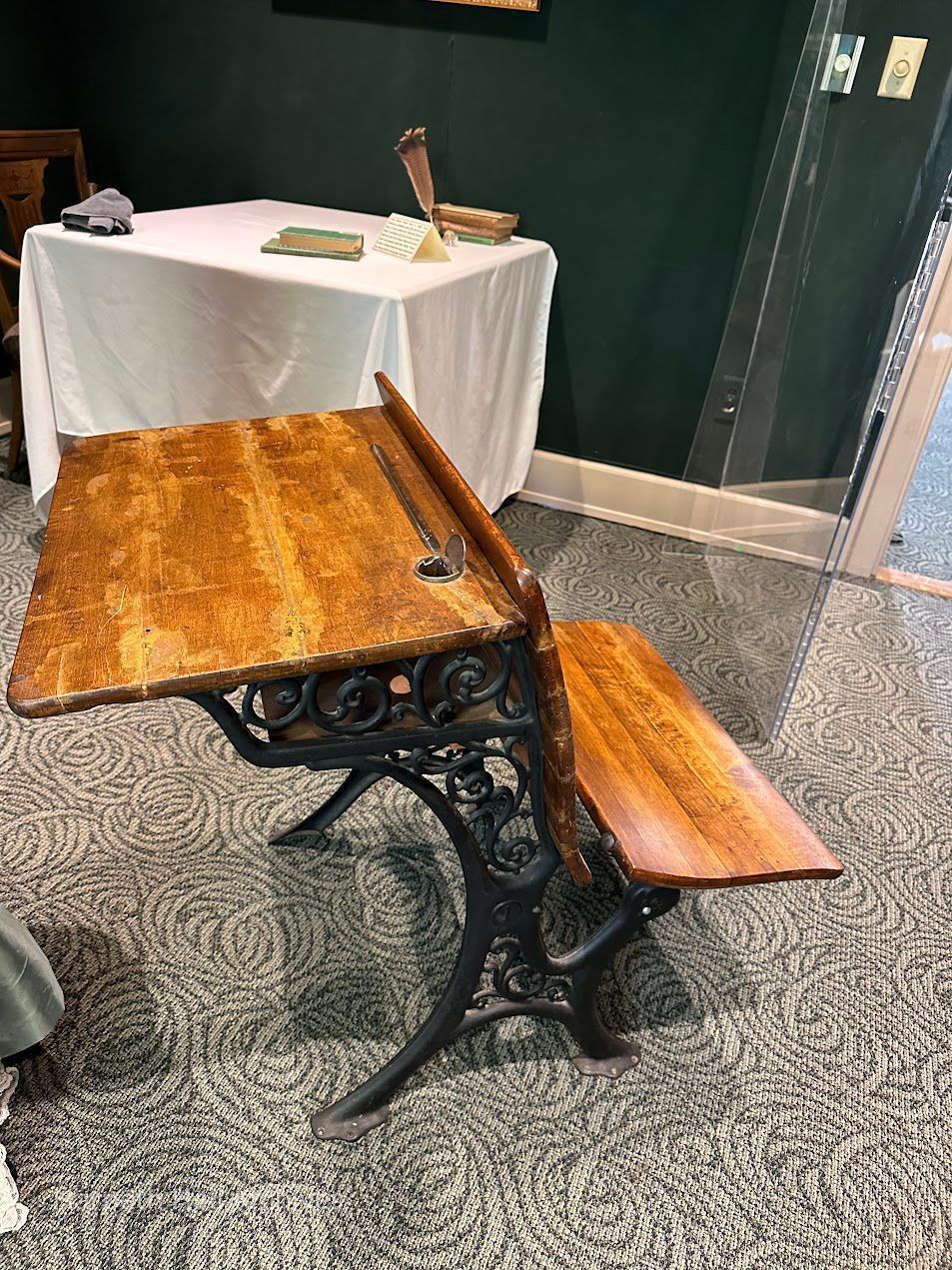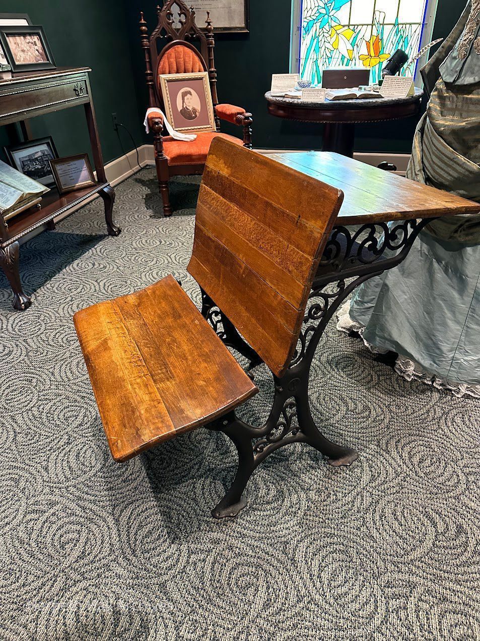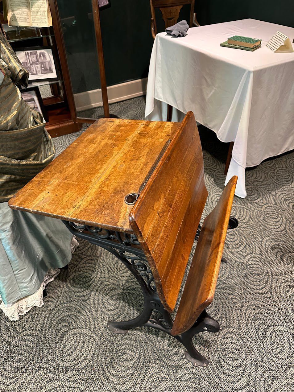 School Desk from Ward Seminary. There is an ink well as well as a ledge for a pen to rest. Beneath the desktop, there is a small shelf for books. the front portion of the desk folds out to function as a chair if there was a desk placed in front of it.