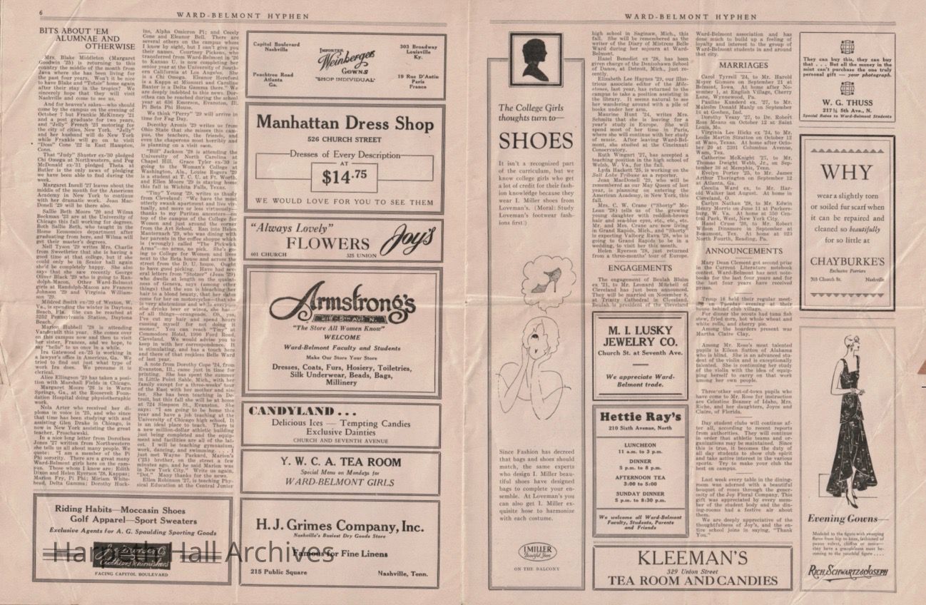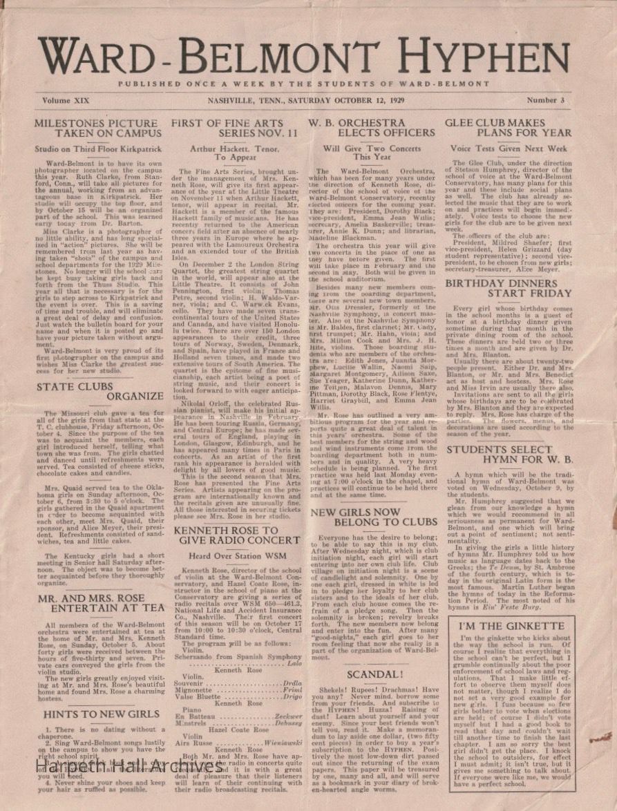 The Ward-Belmont Hyphen was the school's weekly student newspaper. It was named in honor of the merger of Ward's Seminary and Belmont College, resulting in the combined name Ward-Belmont. Students served as reporters, editors, copy readers, etc. The newspaper also included multiple advertisements for local businesses.Collection