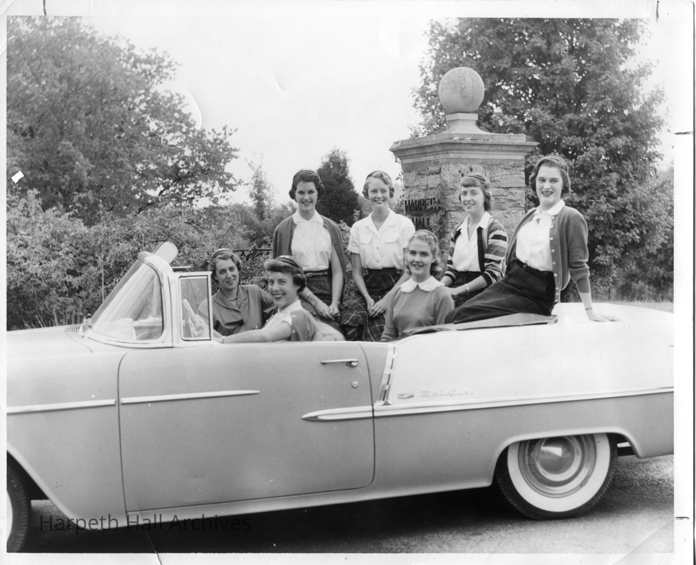 Class of 1954 Seniors in a car at the school entrance wearing their senior beanies.