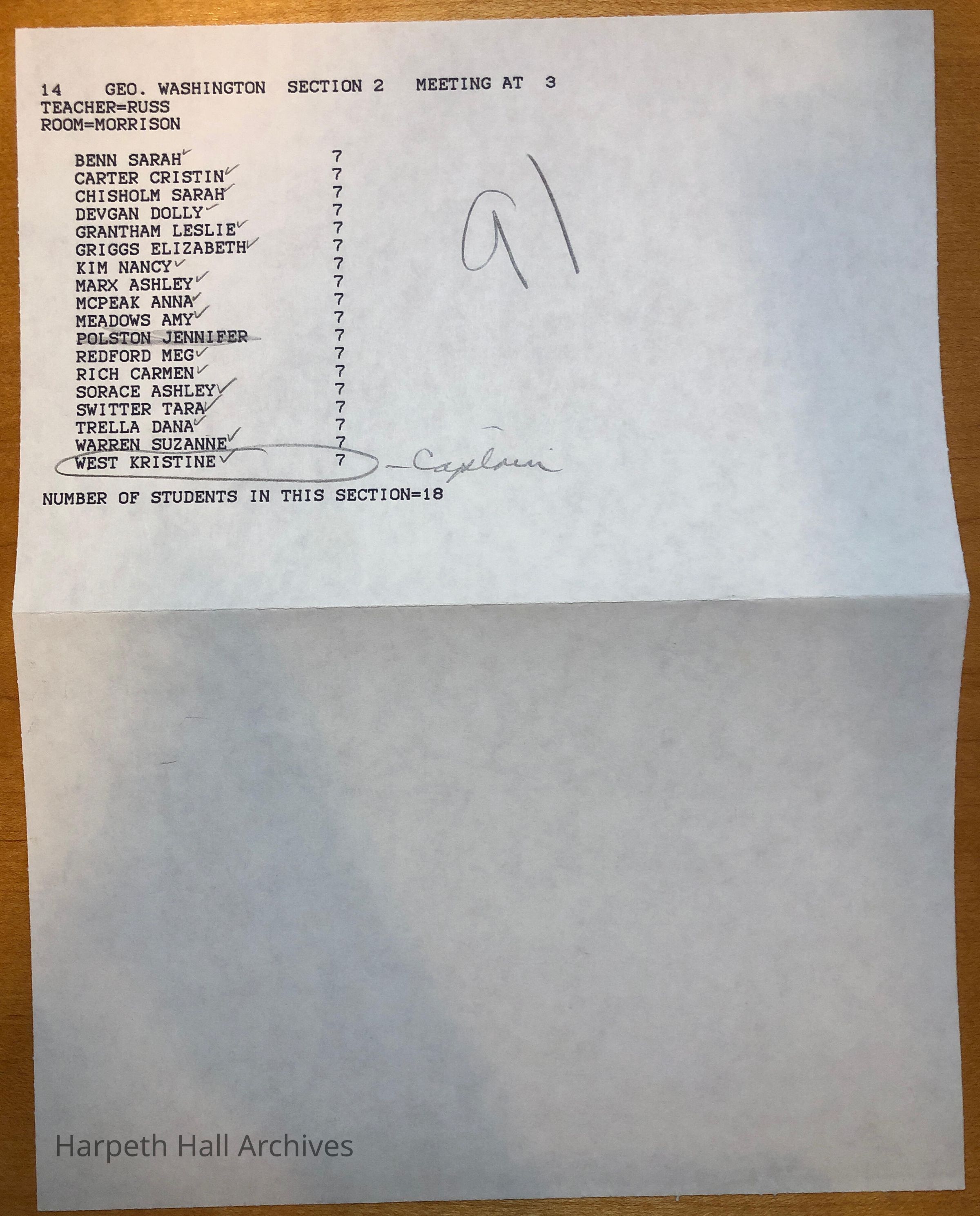 The list of soldiers for the George Washington Day Celebration in 1991 put on by the class of 1996 when they were in seventh grade.Context