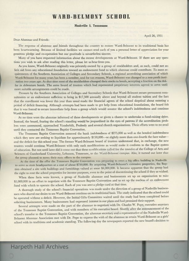 April 26, 1951. Letter discussing the closing of Ward-Belmont by SACSS and TBC