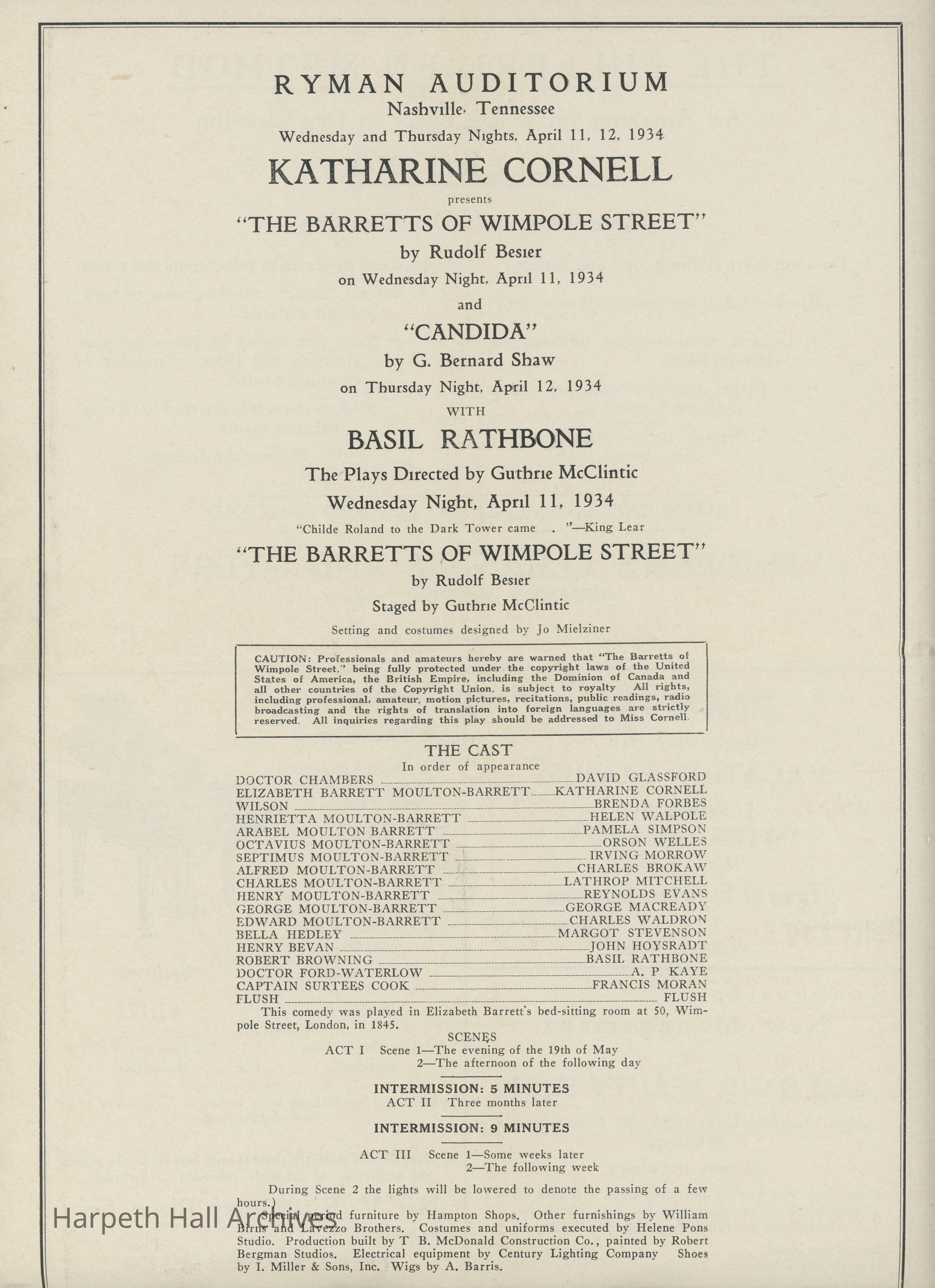 The program for a showing of "The Barretts of Wimpole Street" presented by Katherine Cornell at the Ryman Auditorium in 1934.Collection