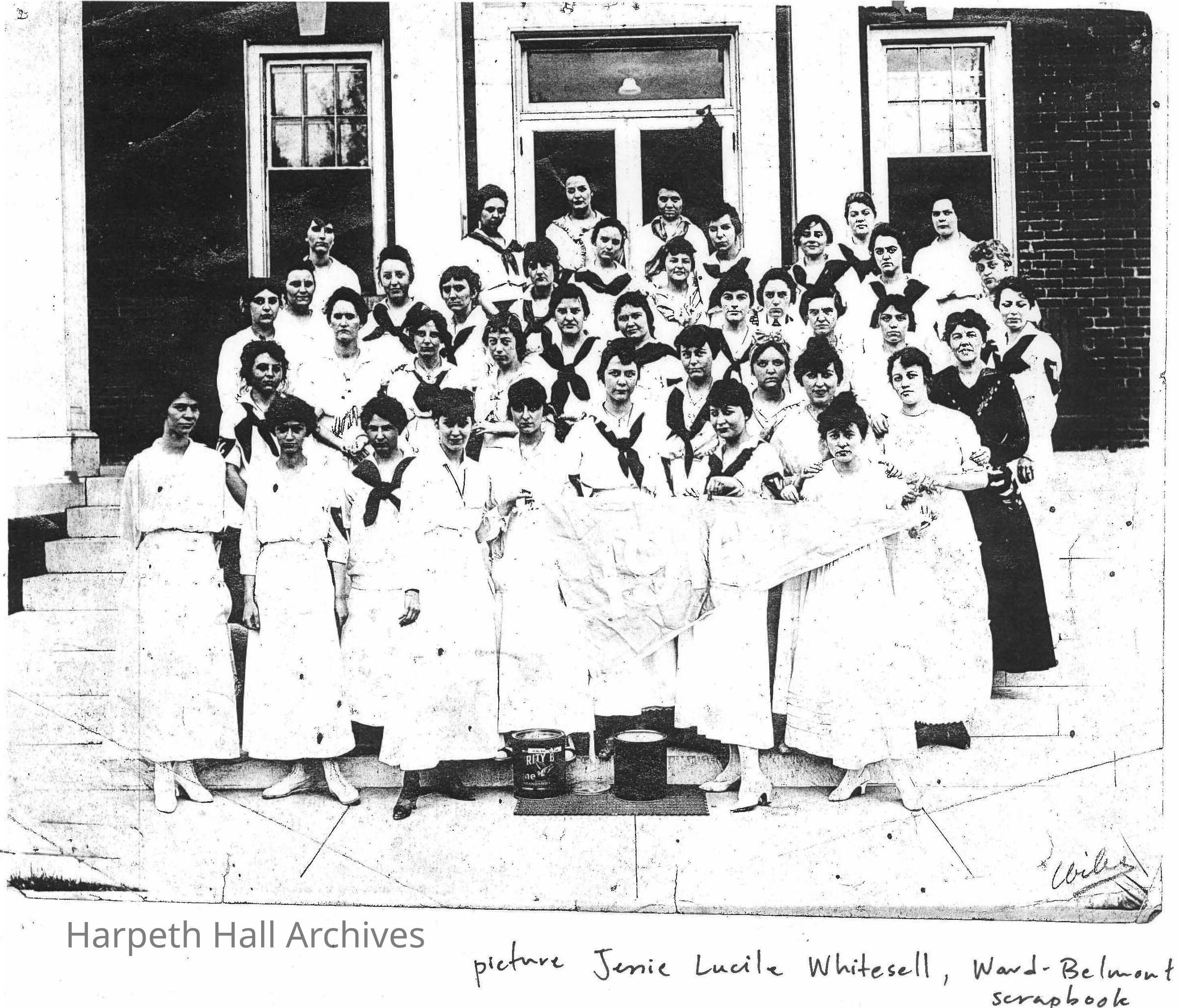 A photo of Ward-Belmont students holding a 1916 flag. Captioned, "pictured Jessie Lucile Whitesell, Ward-Belmont scrapbook".