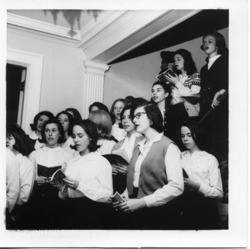 Elizabeth Byrn Fox (1966), Allison Hammond (1968), Virginia "Dinny" Dearborn (1968) singing with multiple students on the stairs at Souby Hall.