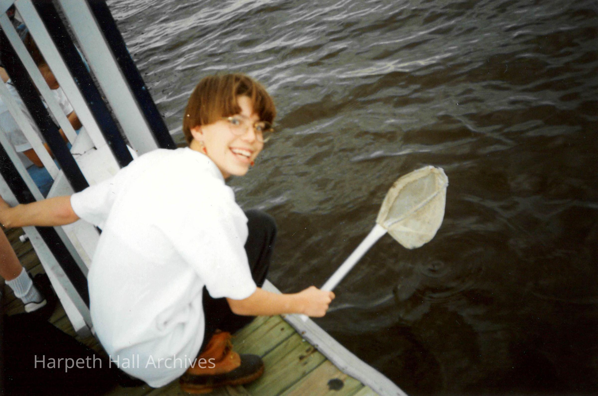 Lucy Kuykendall (1998) holding a fish net above water.Collection