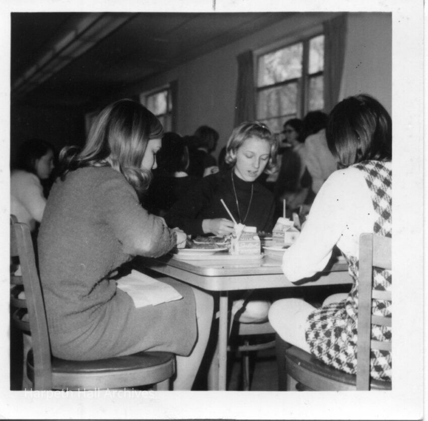 Students having lunch in cafeteria circa 1960's.