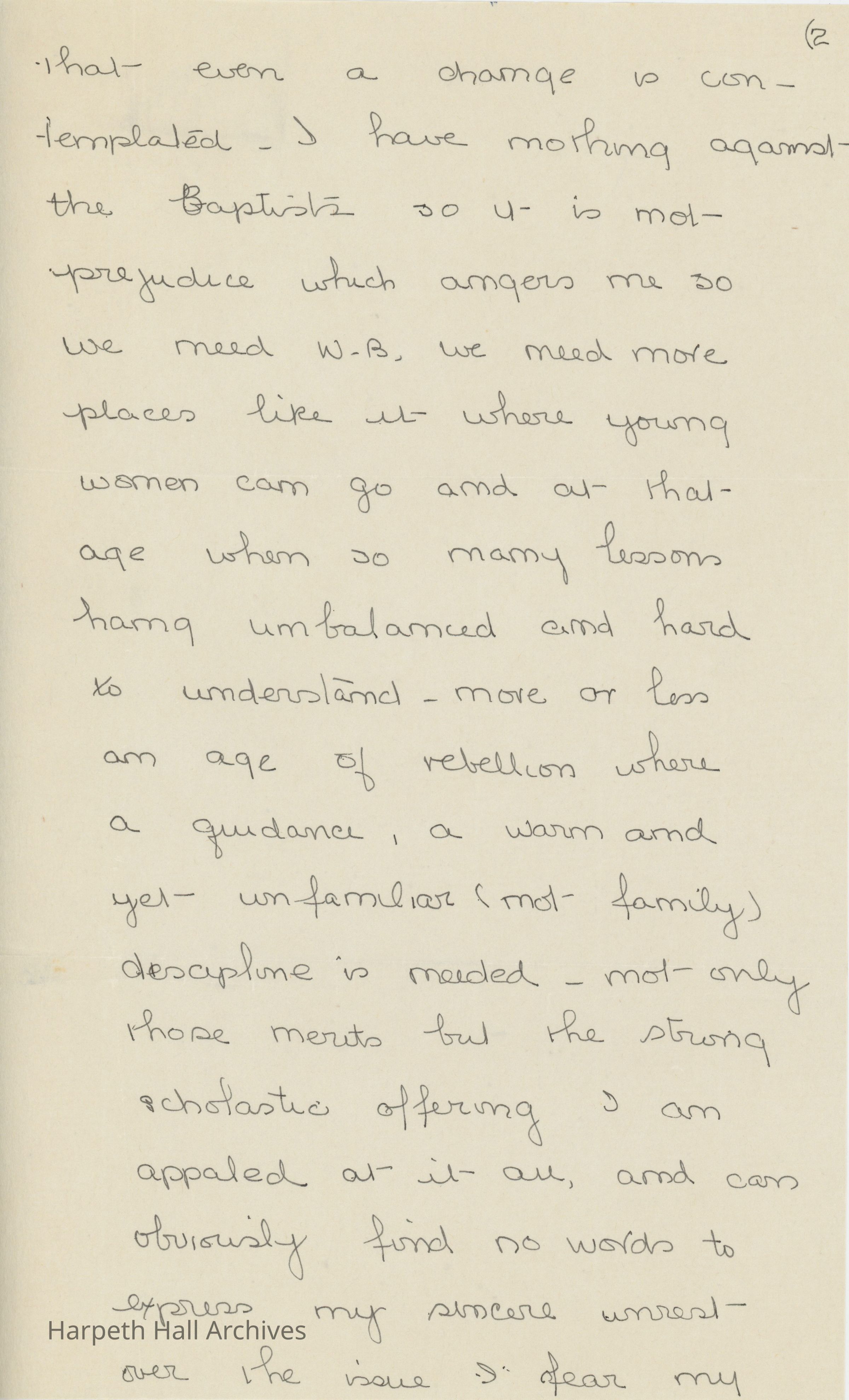 Letter from a Ward-Belmont alumna about her sadness that Ward-Belmont has transferred ownership to the Tennessee Baptist Convention who wish to make the school a co-educational denominational university. She is upset that W-B's traditions, values, and history as they currently stand are coming to an end.Collection