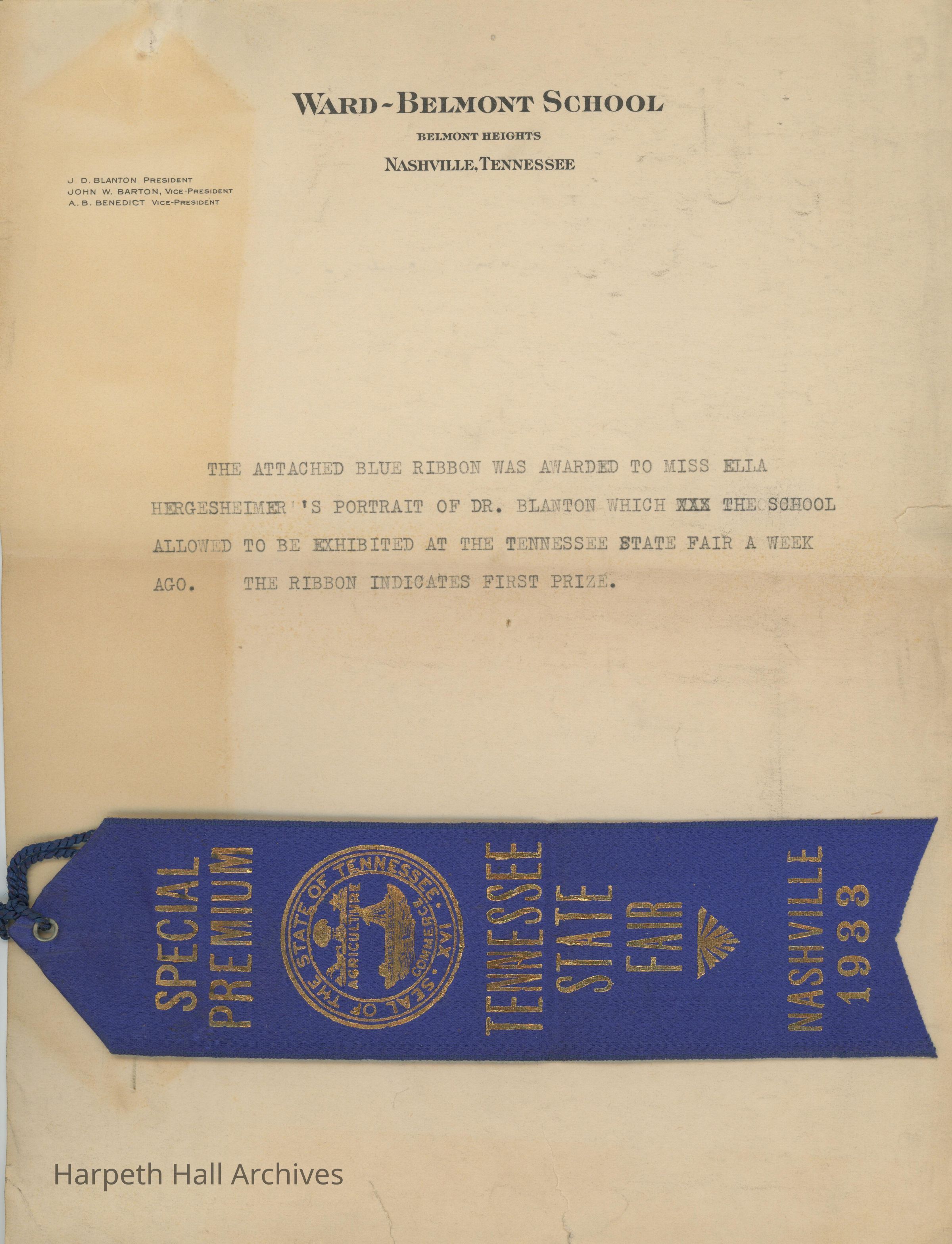 A first-prize blue ribbon from the 1933 Tennessee State Fair and accompanying document with Ward-Belmont letterhead. The ribbon was awarded to Miss Ella Hergesheimer for her portrait of Dr. J. D. Blanton.Context