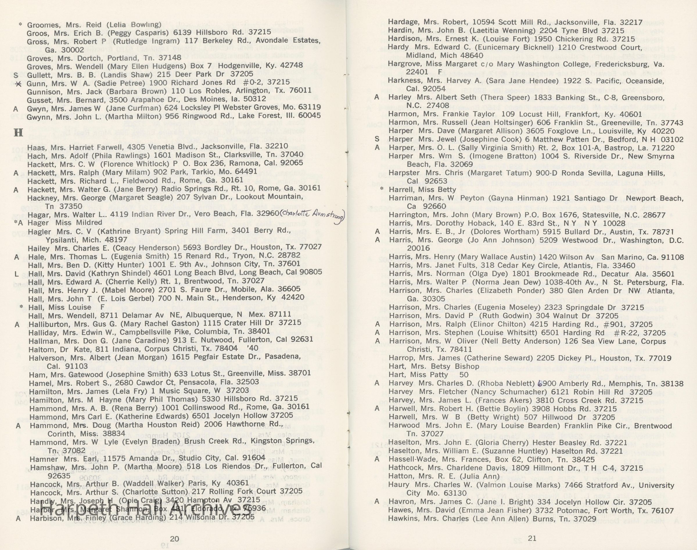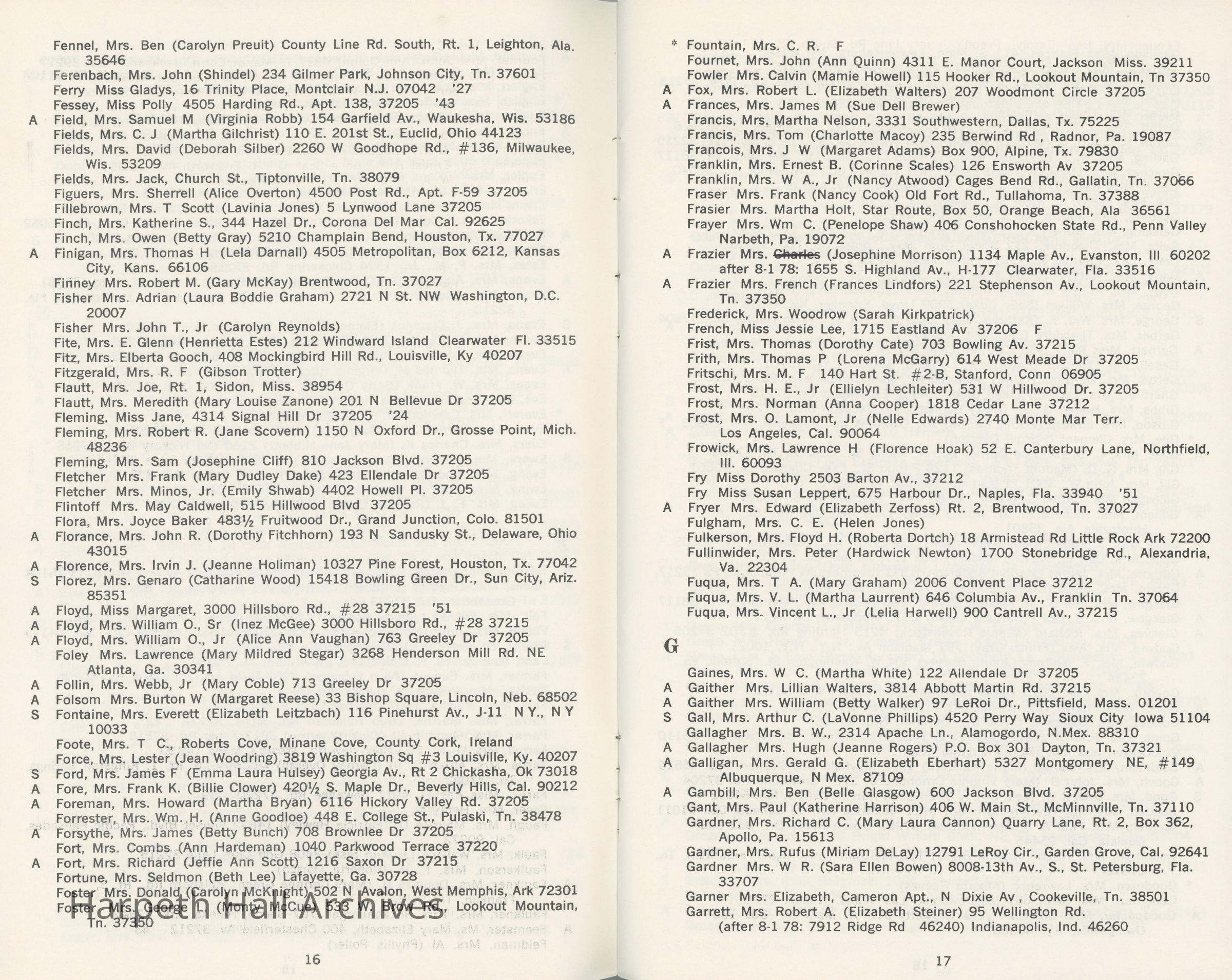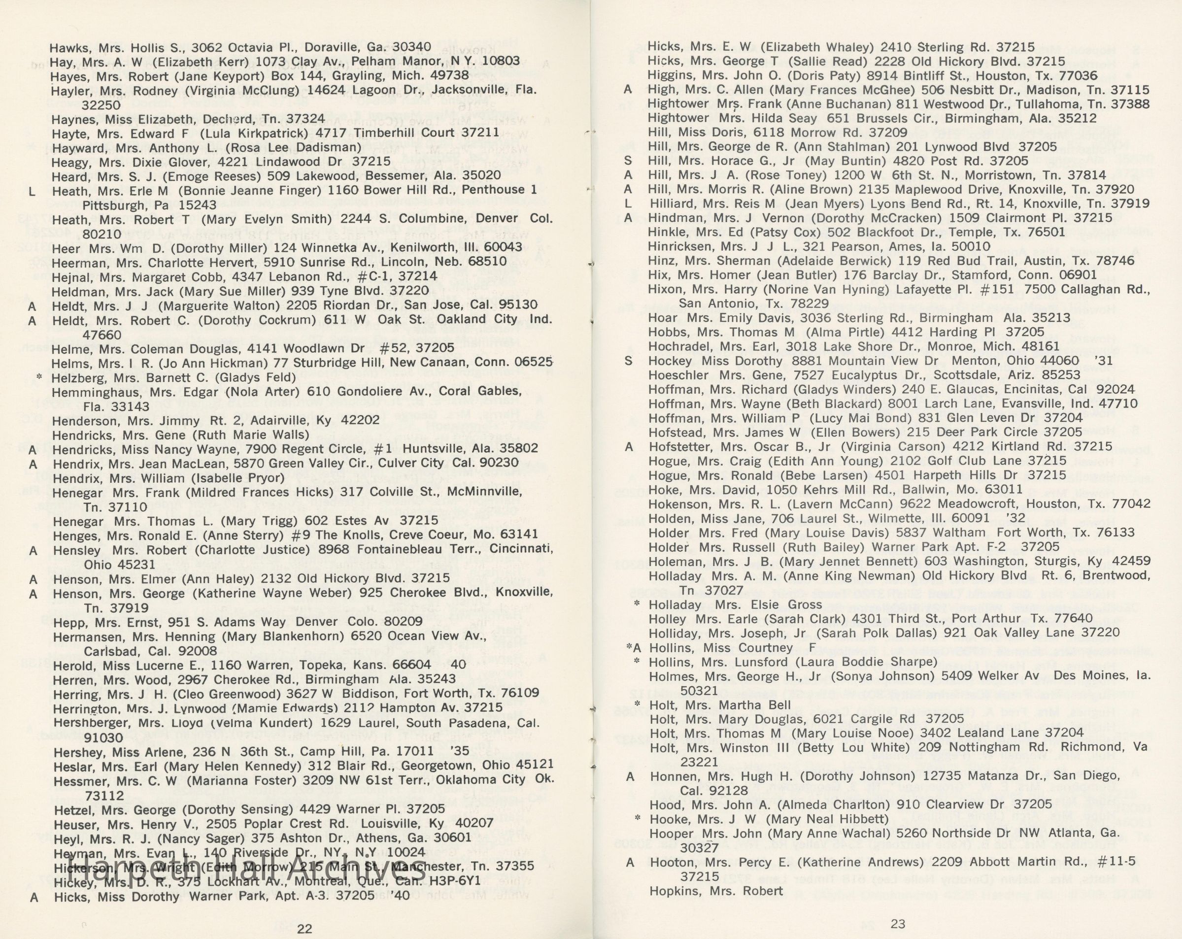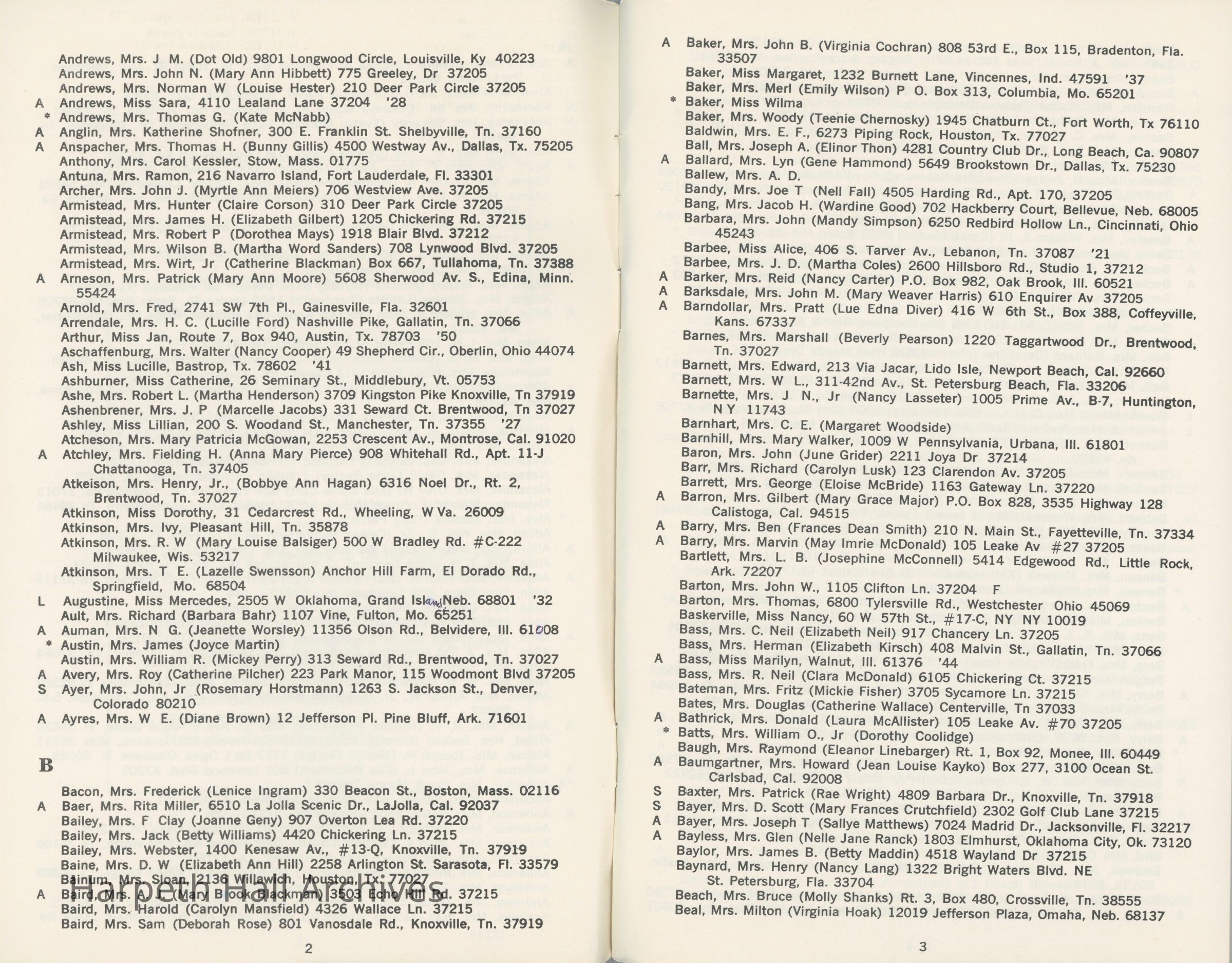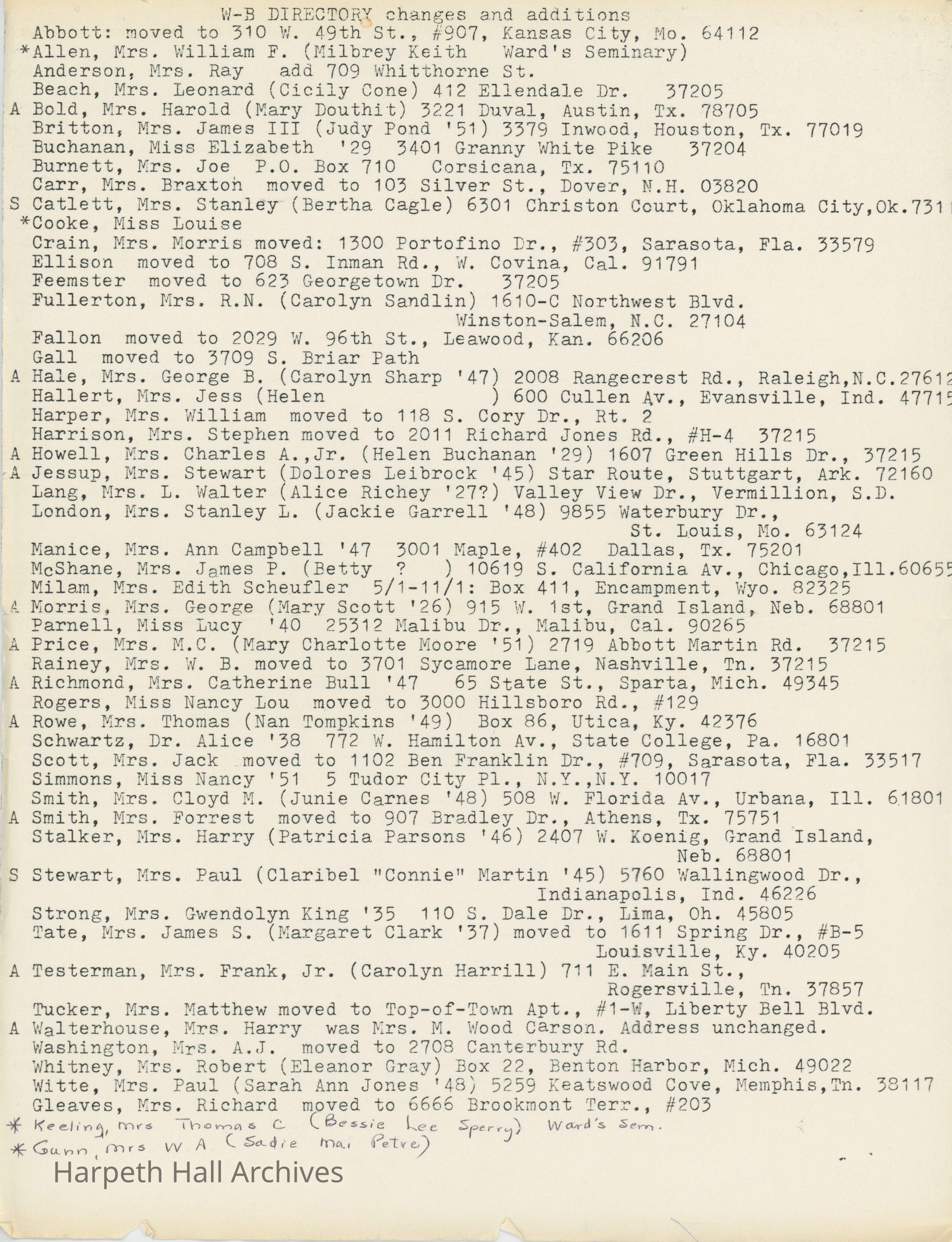 Directory of Ward-Belmont alumnae created in 1978 by Dorothy Barton Webster, including an undated sheet of updates and additions to the directoryCollection