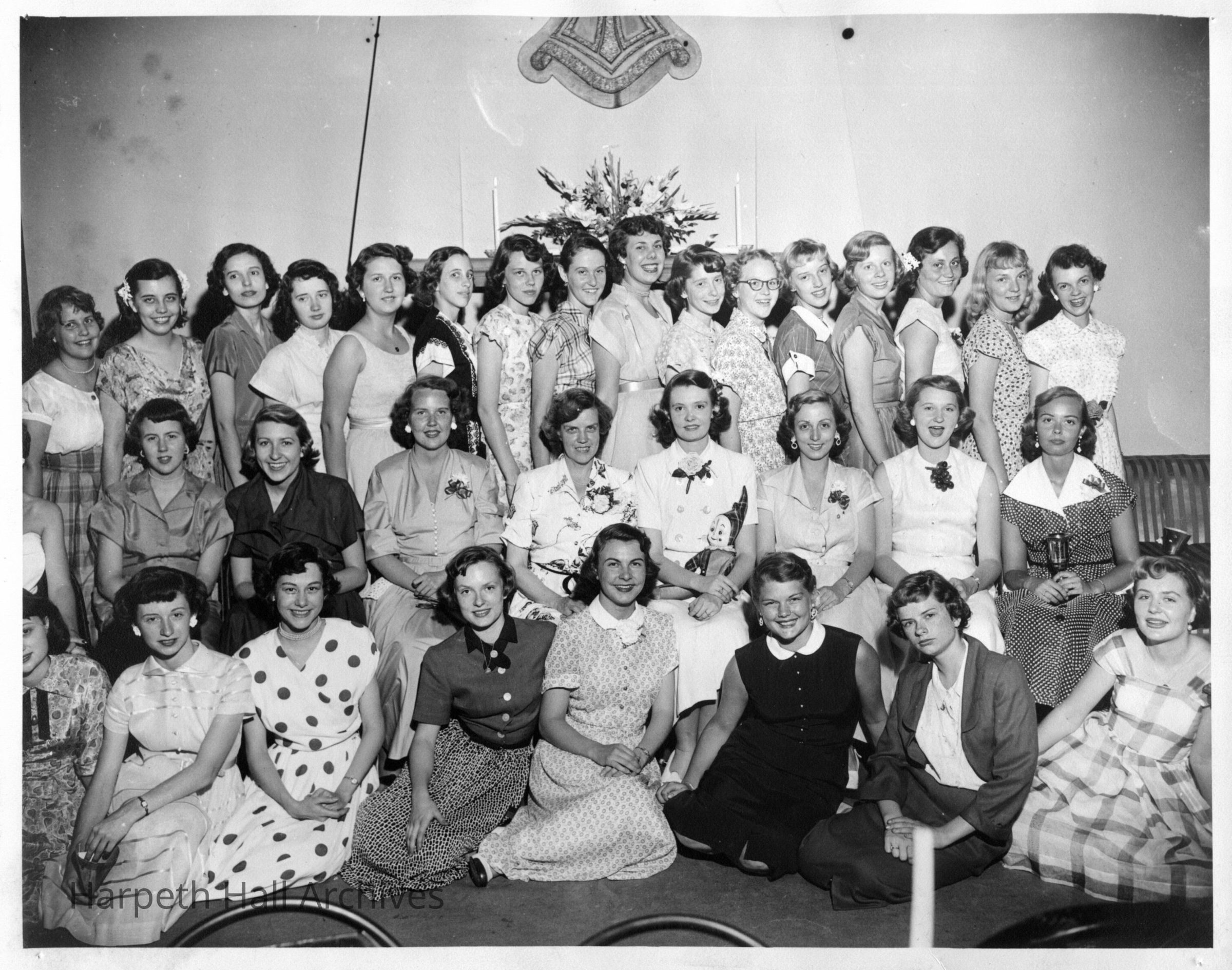 34 girls in nice dress inside a building. Probably a club picture from Ward-Belmont School.