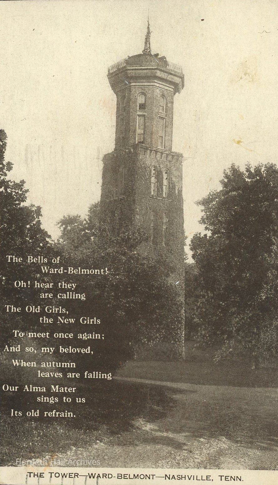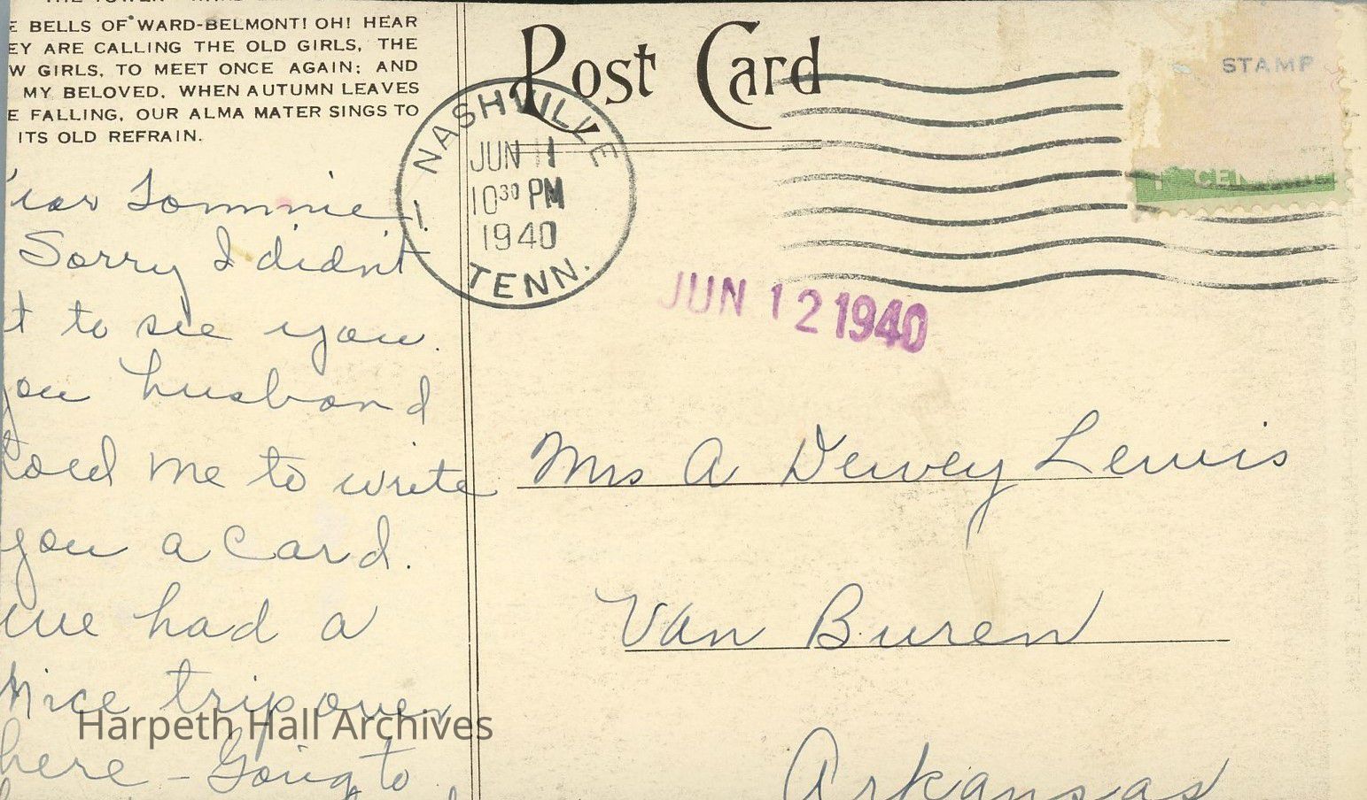 A postcard featuring an image of the bell tower on Ward-Belmont's campus in Nashville, Tennessee. The photo is accompanied by the lyrics to "The Bells of Ward-Belmont" school song. Sent by a Mrs. A Dewey Lewis of Van Buren, Arkansas to a friend by the name of Tommie. Portions of the handwritten correspondence on the back of the postcard have unfortunately been cut off.Context