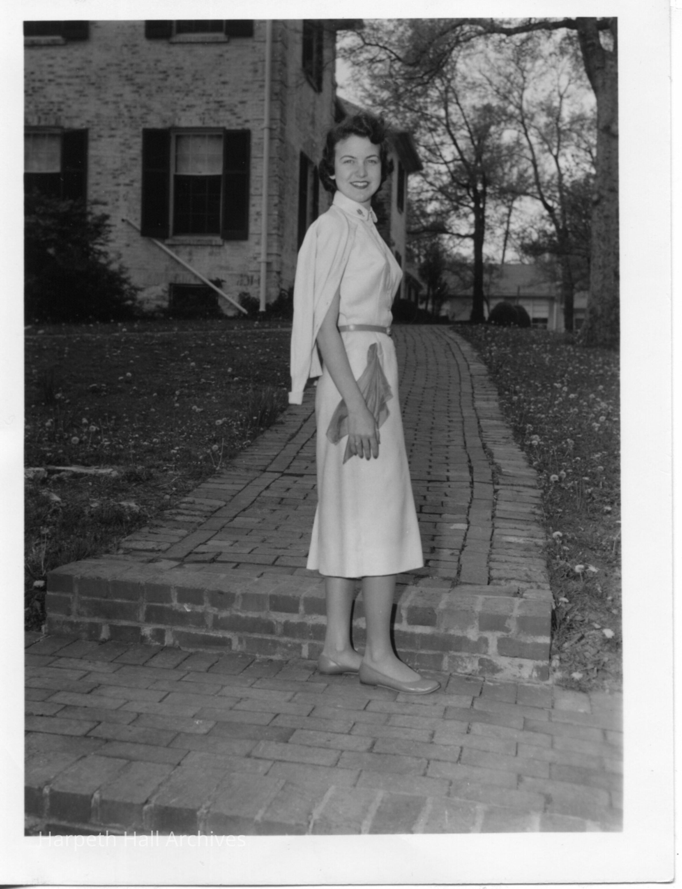 Upper School student on walkway to Souby Hall (no uniform) in the 1960s.