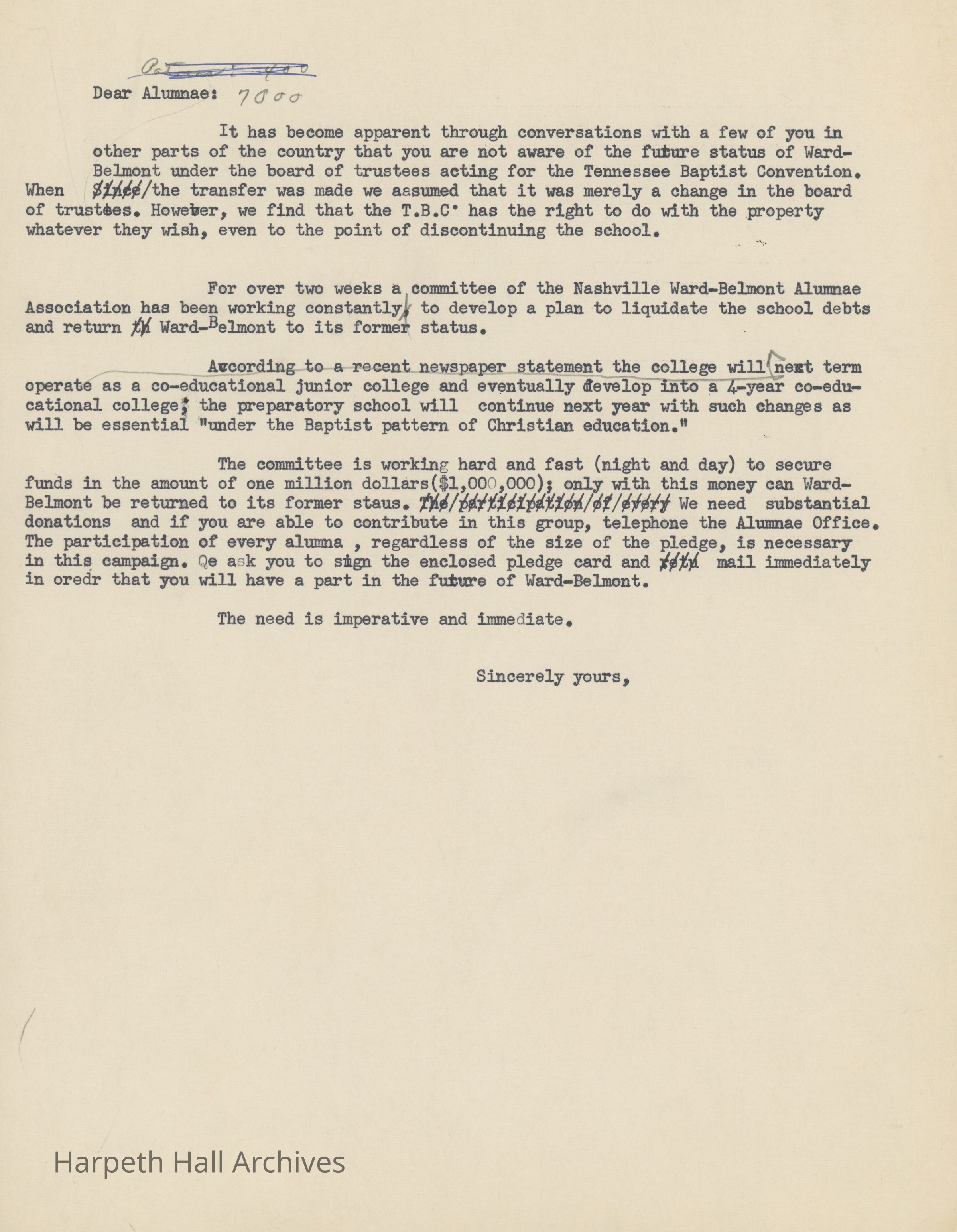 Draft of a letter sent to Ward-Belmont alumni about the sale of the school to the Tennessee Baptist Convention.