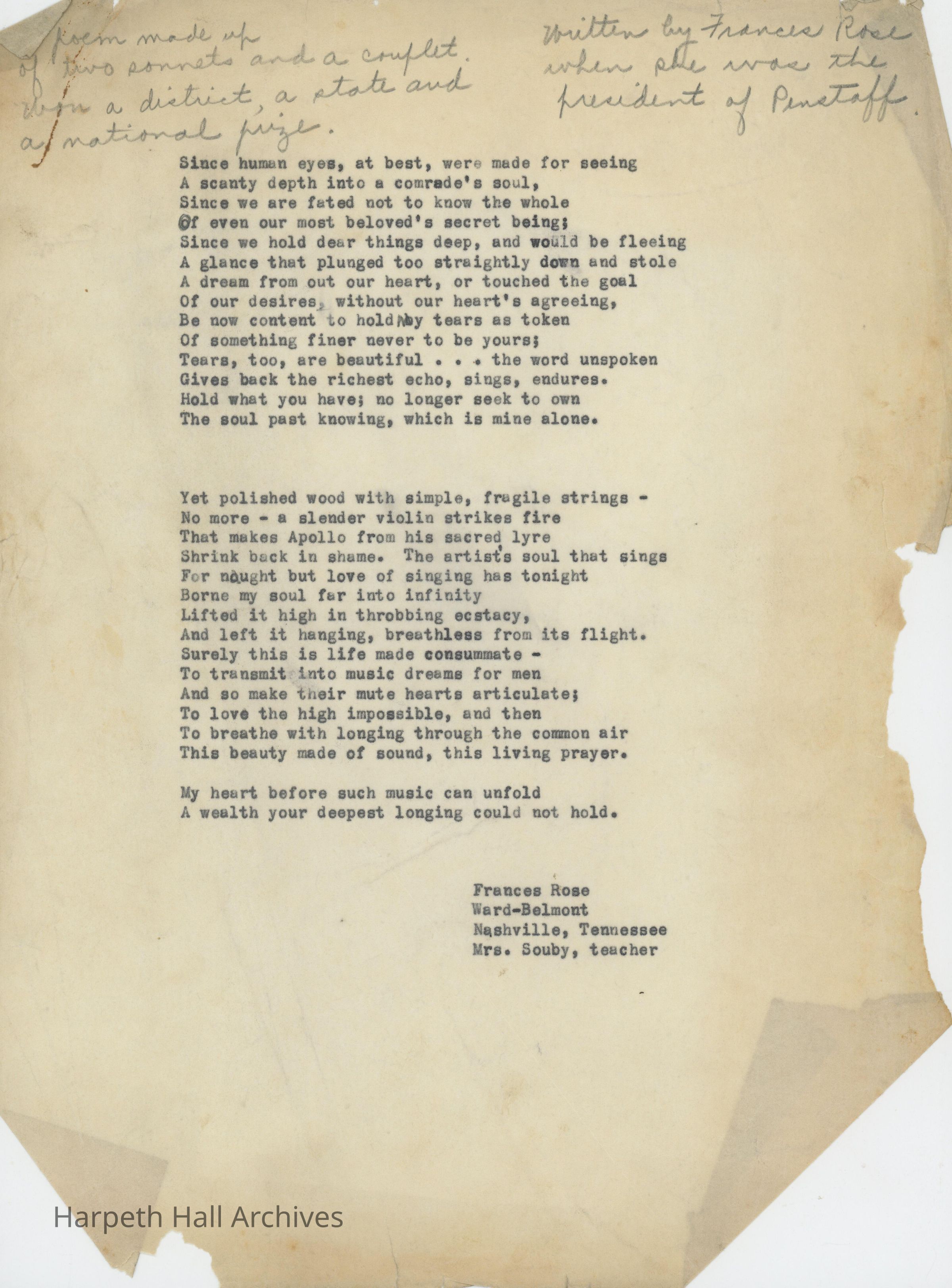A poem written by a Ward-Belmont student, Frances Rose, under the mentorship of Mrs. Susan Souby. Handwritten in the top left corner it states, "A poem made up of two sonnets and a couplet. Won a district, a state and a national prize." In the right hand corner it states, "Written by Frances Rose when she was the president of Penstaff."Collection