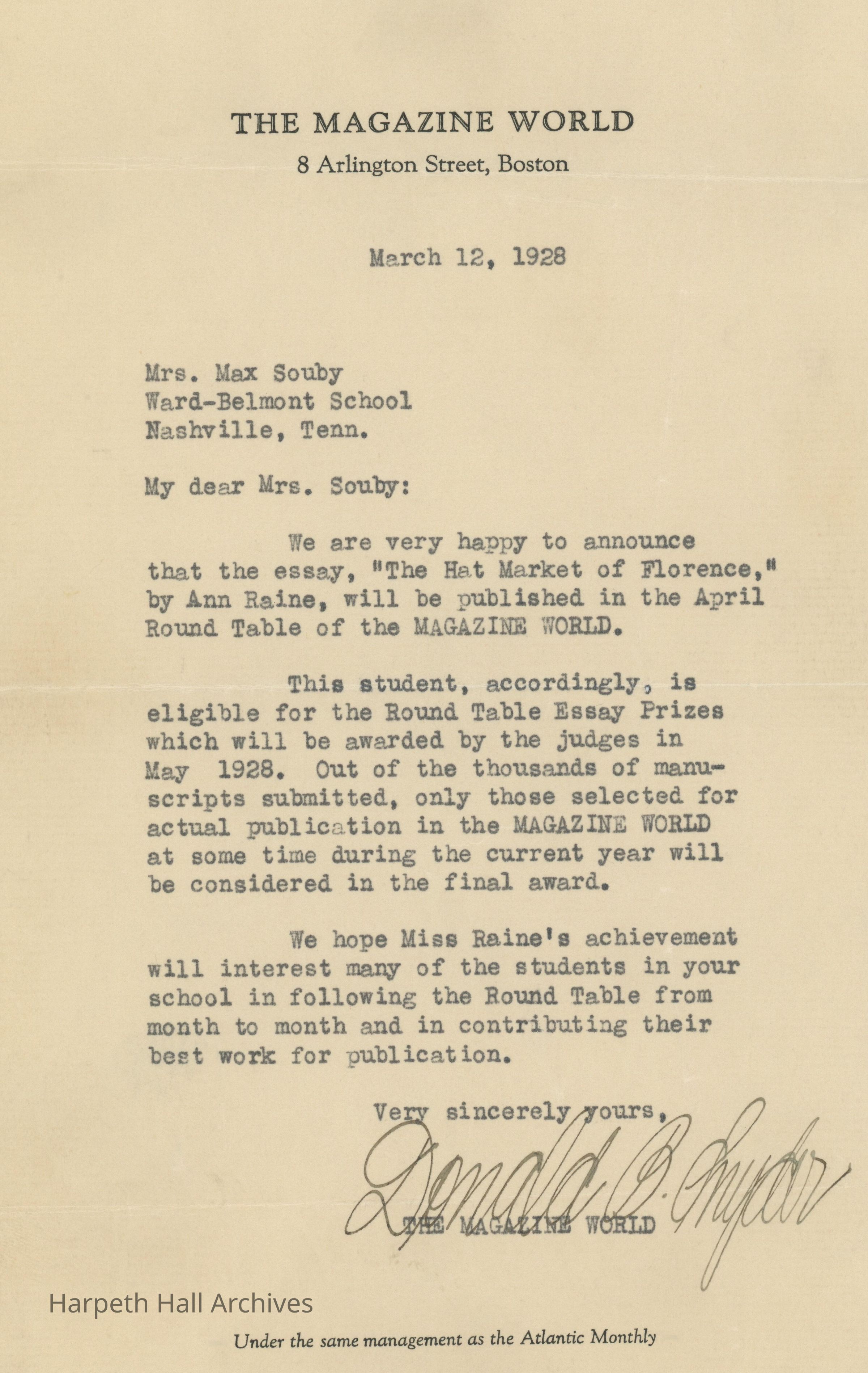 A letter sent to Susan Souby from The Magazine World announcing that Ward-Belmont student Ann Raine's work will be published in their magazine. The letter is dated March 12th, 1928.Collection